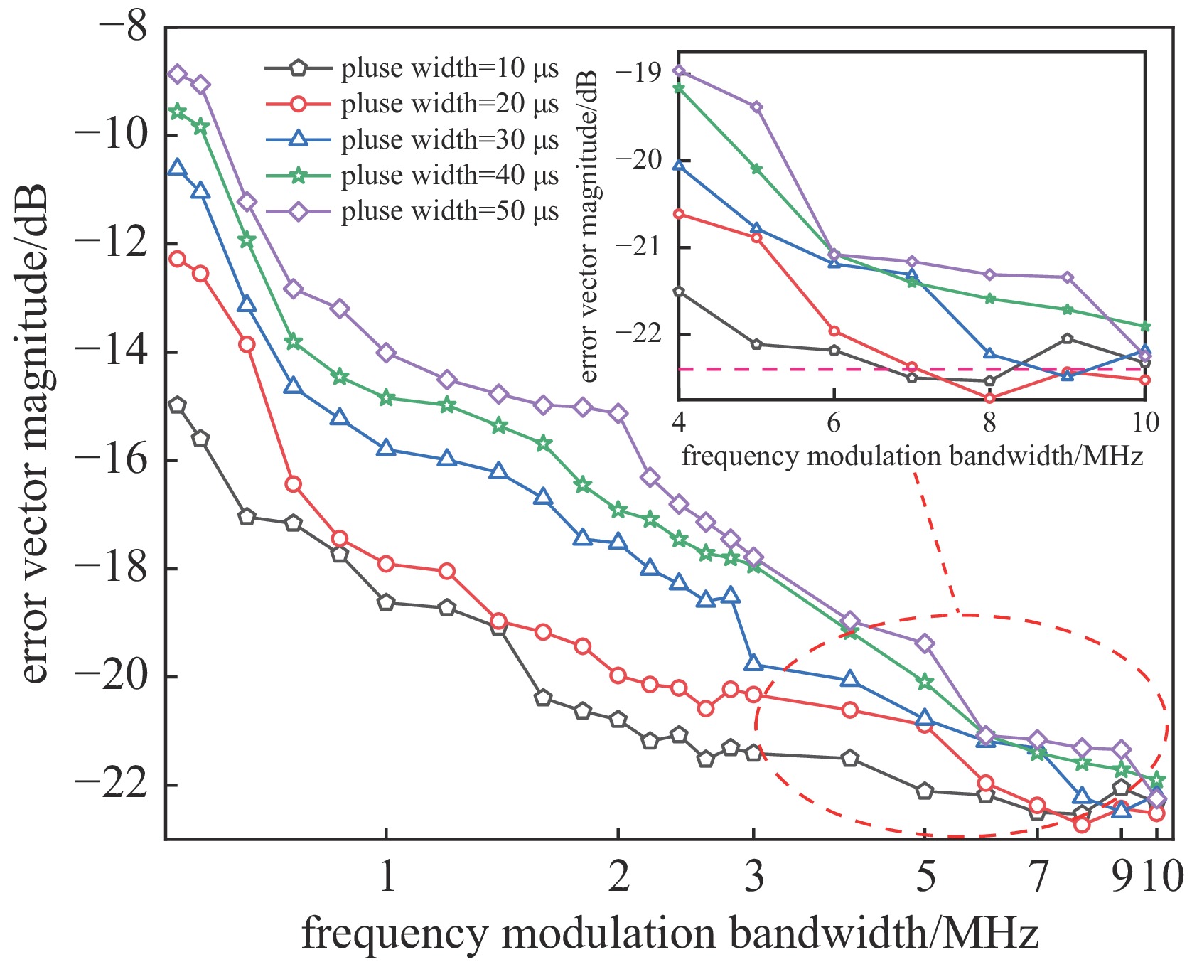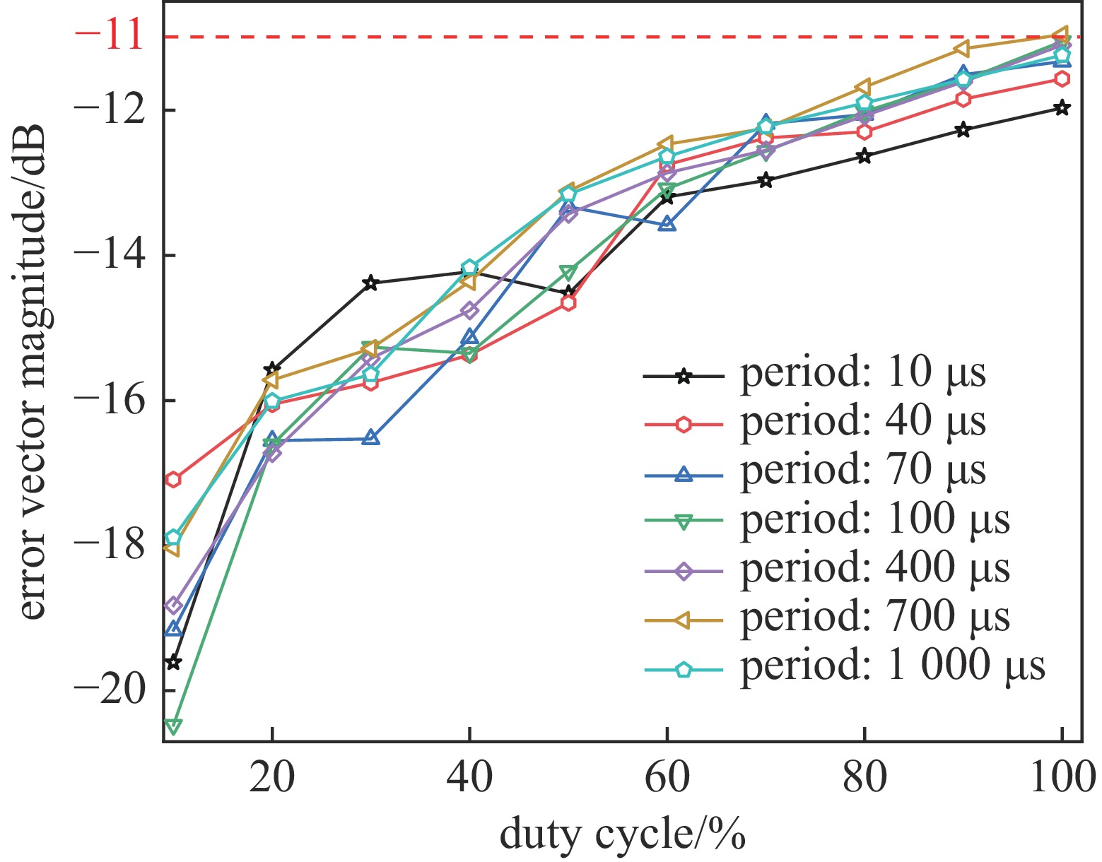 Results indicate that increasing the duty cycle significantly raises the EVM value, although its growth moderates beyond a 30% duty cycle. Under constant duty cycles, pulse-period variations show negligible influence on EVM. As chirp bandwidth increases from 1 MHz to 3 MHz, the EVM decreases from −10.5 dB to −19.8 dB, a reduction of 9.3 dB, but remains nearly constant with further bandwidth expansion to 10 MHz.