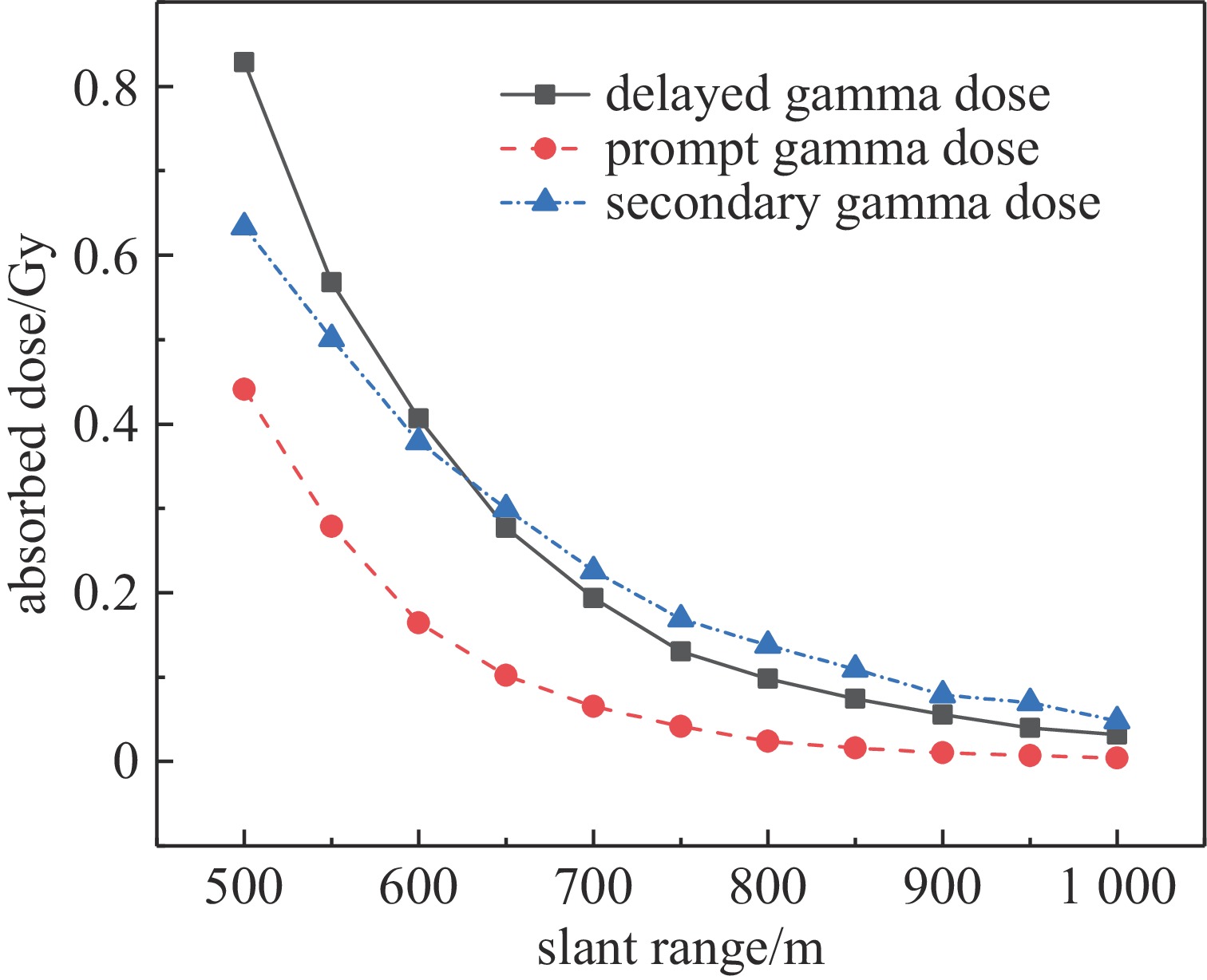The simulation results show that within a time window of 0.2– 0.5 s: at a distance of 500 m from the explosion source, the total dose of delayed gamma radiation reaches 0.829 Gy, which is 1.88 times that of the instantaneous gamma radiation dose (0.441 Gy); At a distance of 1000 m from the explosion source, the delayed gamma dose generated by fission products alone is 0.0318 Gy, which is 7.6 times that of the instantaneous gamma dose (0.0042 Gy), indicating that the hazard of delayed gamma is significantly higher than that of instantaneous gamma at longer distances. The secondary gamma dose generated by neutron leakage decays from 0.634 Gy at 500 m to 0.0485 Gy at 1000 m.