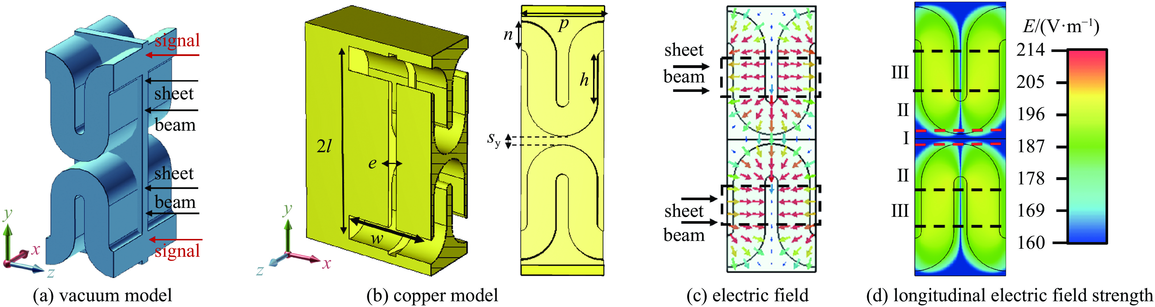 Three-dimensional electromagnetic simulations in CST were conducted to verify the high-frequency characteristics, electric field distribution, and amplification performance of the proposed SWS, thereby confirming the validity of the design.