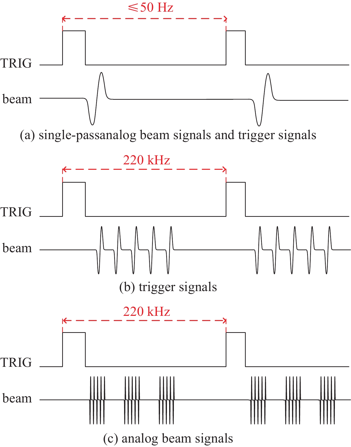 The core of the signal source is an FPGA board. Firstly, a 250 MHz clock signal with a 25% duty cycle was generated by the PLL and directly routed through the MRCC pin. After completing the impedance matching, the RF signal was processed via differential circuit to obtain the required simulated beam signals. Then, the required signals were amplified using the RF amplifier. After the 1∶4 power division, beam signals with four adjustable amplitudes output channels were finally acquired. The trigger signal was supplied directly from the FPGA I/O pins configured for LVCMOS33 operation at 3.3 V, to meet the required LVTTL of BPM electronics.