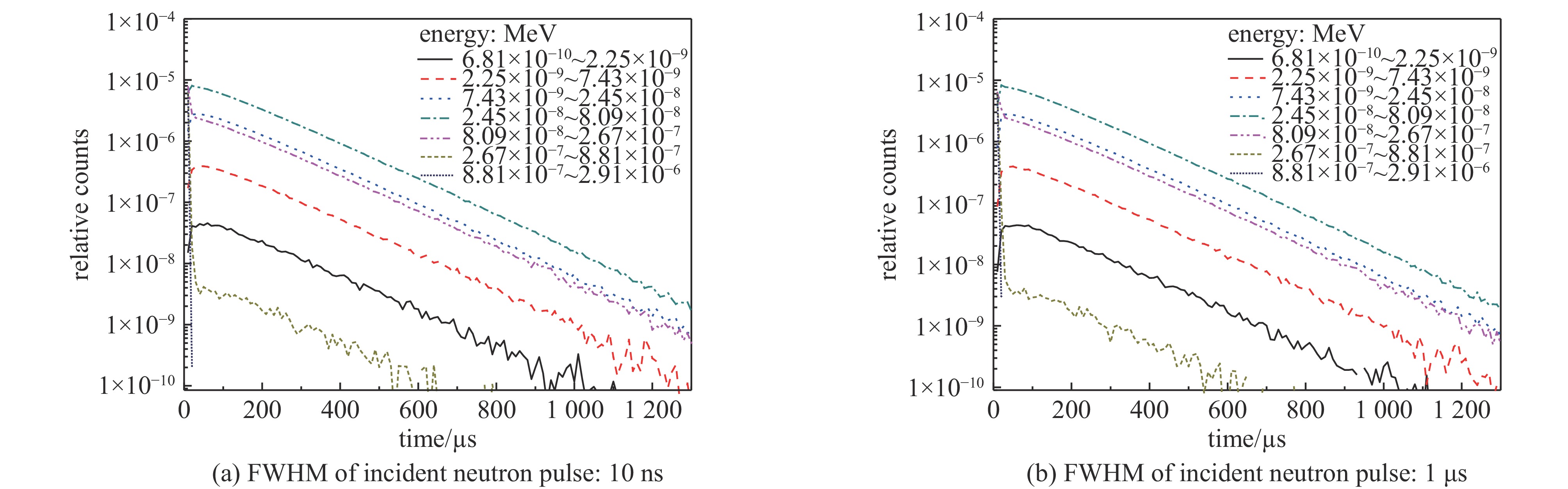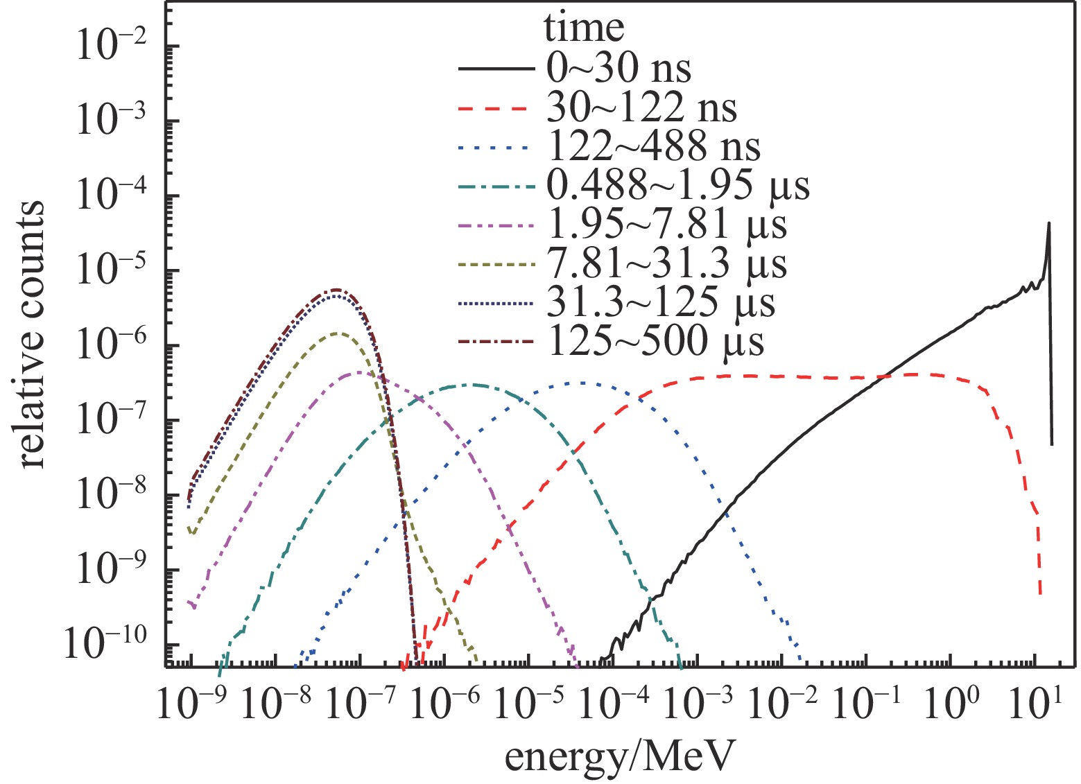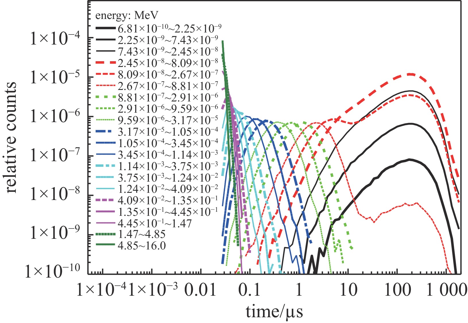 The calculated results show that the evolution of the neutron spectrum is rapid at first, and becomes slower later. After 31 μs, the neutron spectrum almost no longer changes. The time distribution is different for neutrons of different energy. The lower the energy, the wider the distribution. For the energy of thermal neutrons, the time lasts more than 1 m s. Utilizing the time distribution of different energy, the change of counts of the long counter over time is calculated.
