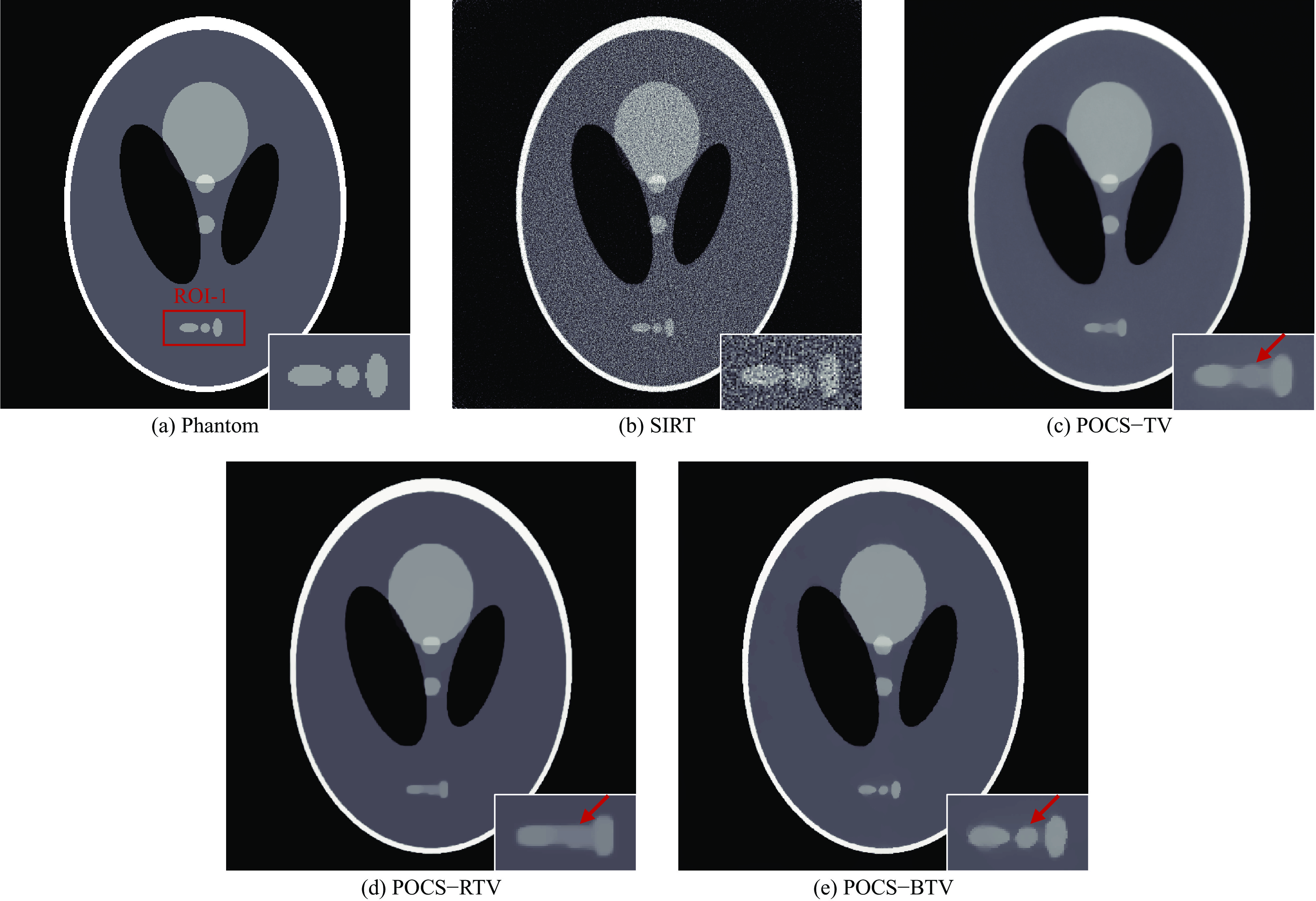 A novel iterative algorithm, termed Projection Onto Convex Sets regularized by Bilateral Total Variation (POCS-BTV), is proposed. The algorithm integrates BTV, a regularizer known for its superior edge-preservation properties, into the POCS framework to constrain the solution during iterations. The performance of POCS-BTV was evaluated against the Simultaneous Iterative Reconstruction Technique (SIRT), POCS-TV, and POCS-RTV algorithms. The evaluation involved two stages: a simulation experiment using a Shepp-Logan phantom with added Poisson-Gaussian noise to mimic low-SNR conditions, and a physical experiment using a 70 mm diameter high-strength steel wire rope phantom scanned by a 9 MeV Rhodotron accelerator CT system.