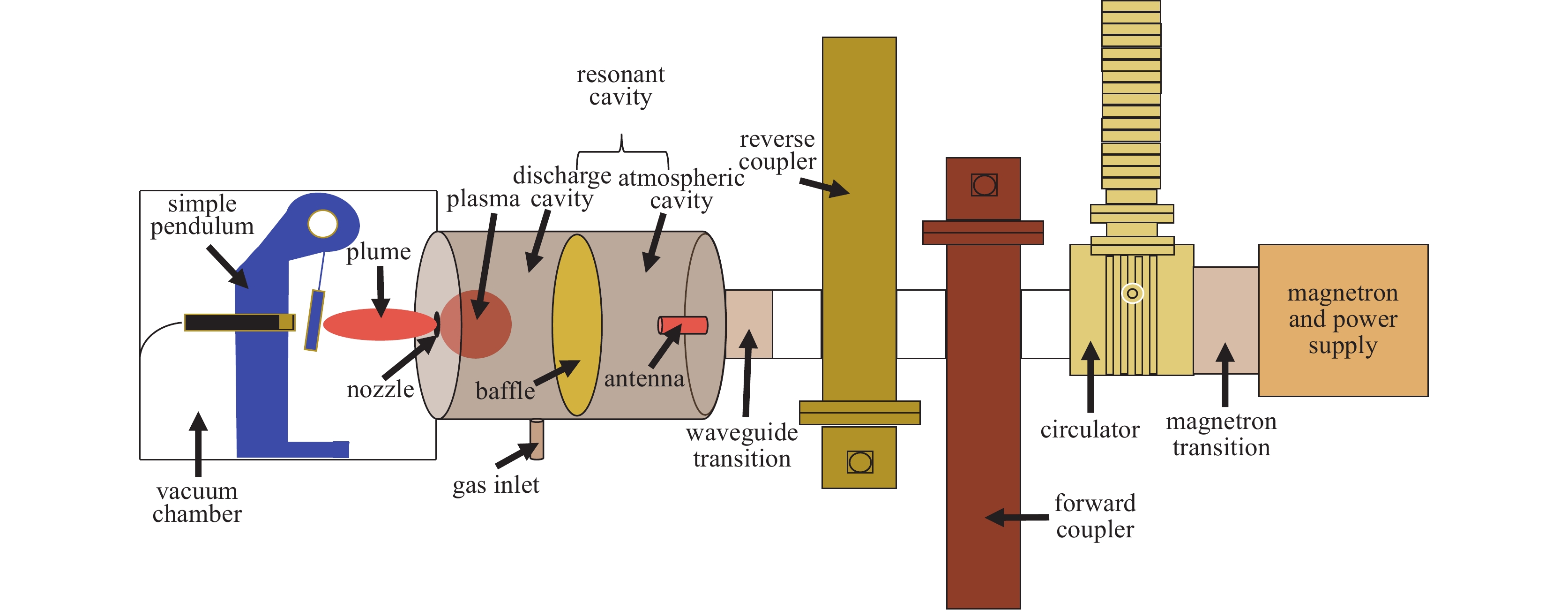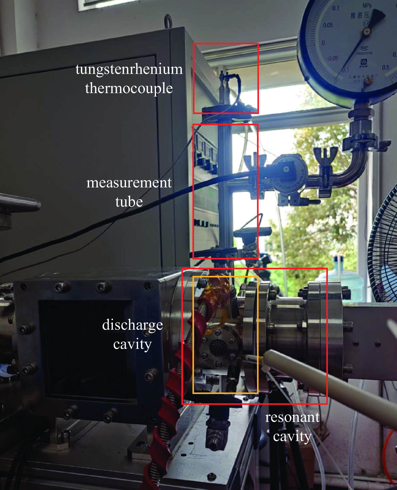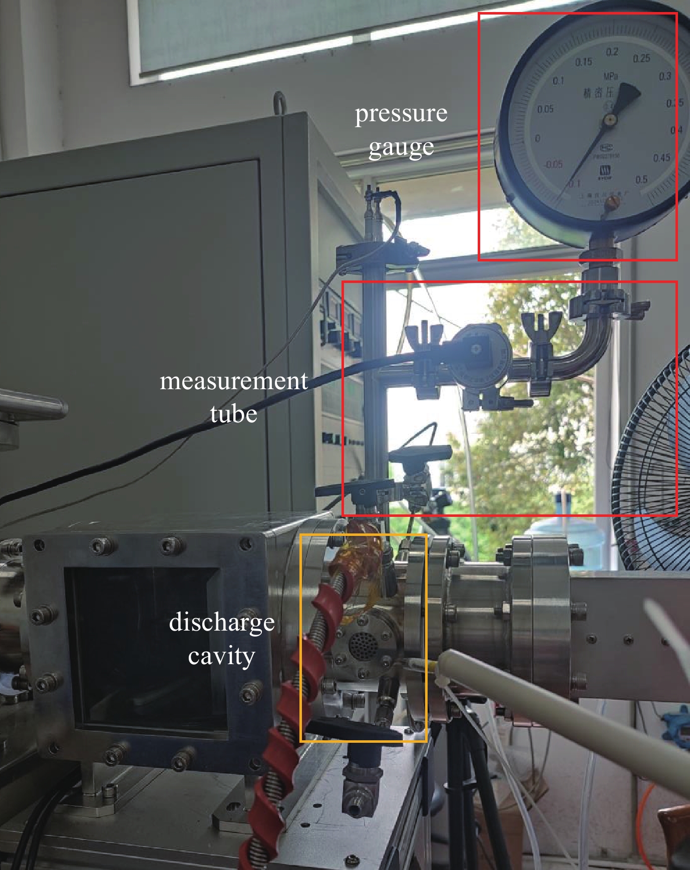 Four thrust measurement methods were developed: 1) Modified NH-2 electronic push-pull force gauge (2 N range, 0.001 N resolution) with a 5.5 cm metal target and 3D-printed bracket; 2) Pendulum thrust meter using an eddy current displacement sensor (2 mV/μm sensitivity) to measure small displacements, with force analysis under small angles (<10°); 3) Thrust calculation based on resonant cavity gas temperature (measured by WRe26 thermocouple, 0−1800 ℃ range) using adiabatic process and ideal gas equations; 4) Thrust calculation based on resonant cavity pressure (measured by a precision pressure gauge) via derived formulas. Experiments used a 1500 W 2.45 GHz magnetron microwave source with helium as the working fluid, conducted under cold gas (microwave off) and discharge (microwave on) conditions.
