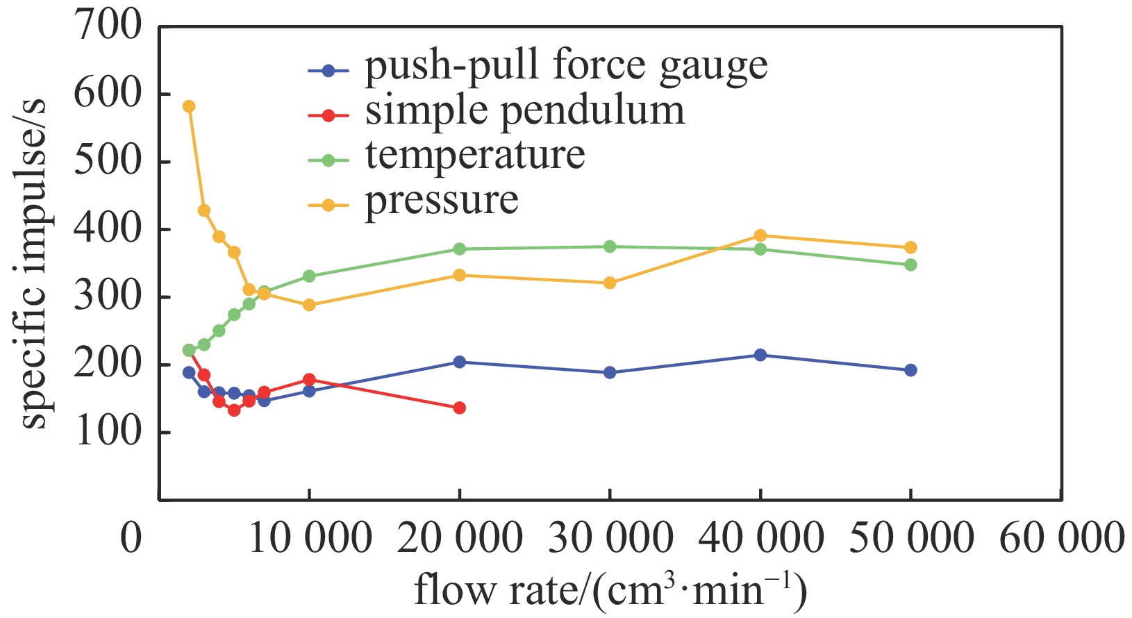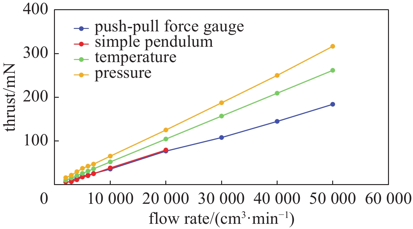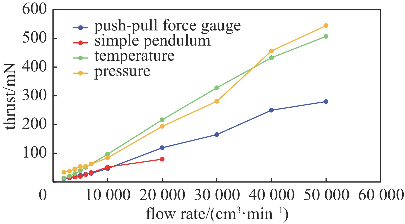 In cold gas experiments, thrust increased almost linearly with helium flow; push-pull force gauge and pendulum data were highly consistent, while temperature- and pressure-based calculated values were higher. In discharge experiments, thrust still increased with flow (though slower at high flow), specific impulse remained stable (with a slight drop at high flow), and temperature- and pressure-based values showed better consistency. All four methods performed well within the 0−600 mN thrust range, with indirect methods consistent with direct measurements.