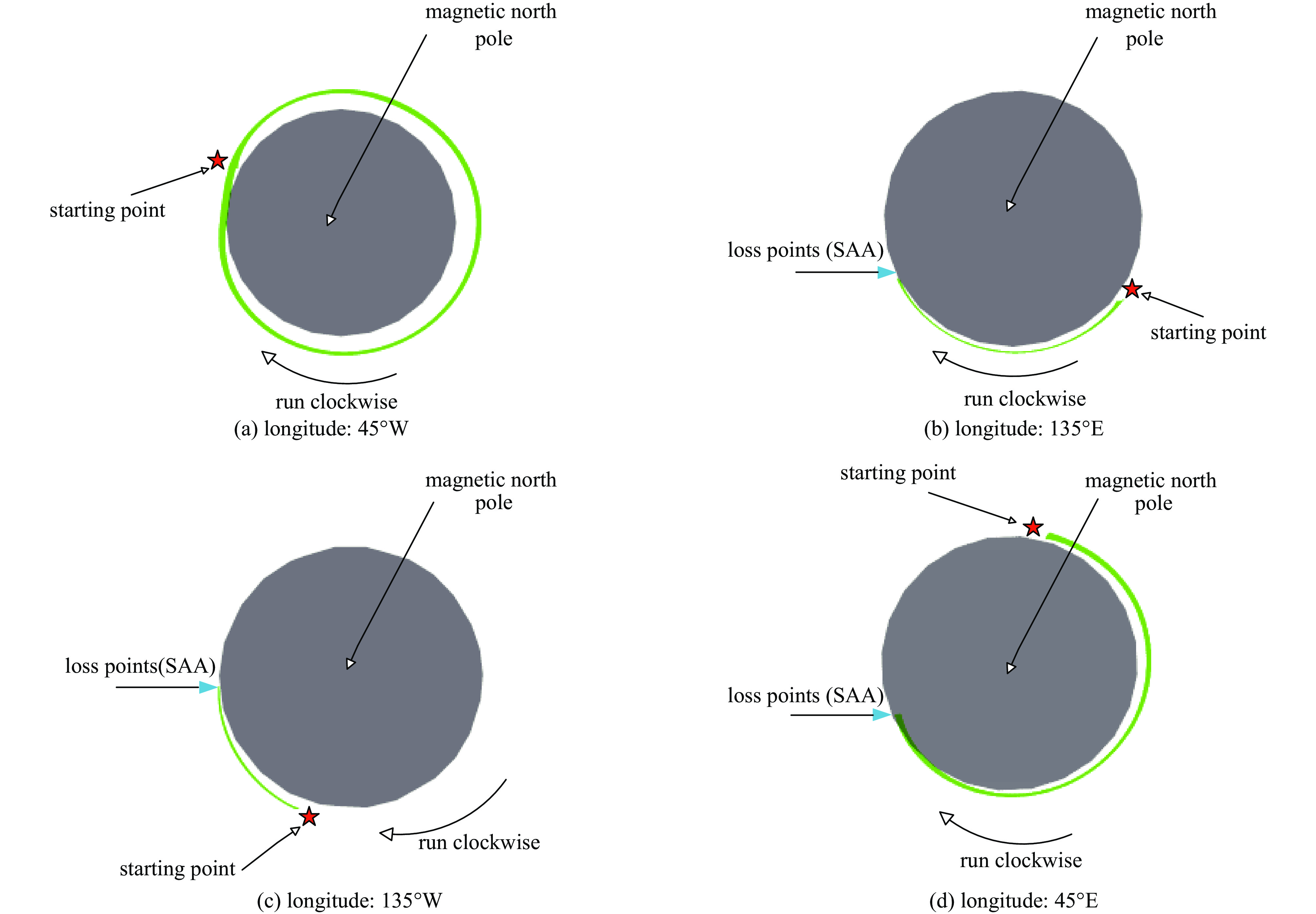 The centered dipole model yielded relatively regular and symmetric electron drift trajectories. Asymmetry was observed in the eccentric dipole model. The IGRF model produced the most complex and irregular trajectories, best reflecting the actual variability of Earth's magnetic field. Regarding the relationship between loss cone angle and L-value, the IGRF model exhibited the largest loss cone angles, indicating the most stringent conditions for particle trapping. Furthermore, injection longitude significantly influenced loss processes, with electrons approaching the center of the SAA being most susceptible to drift loss.