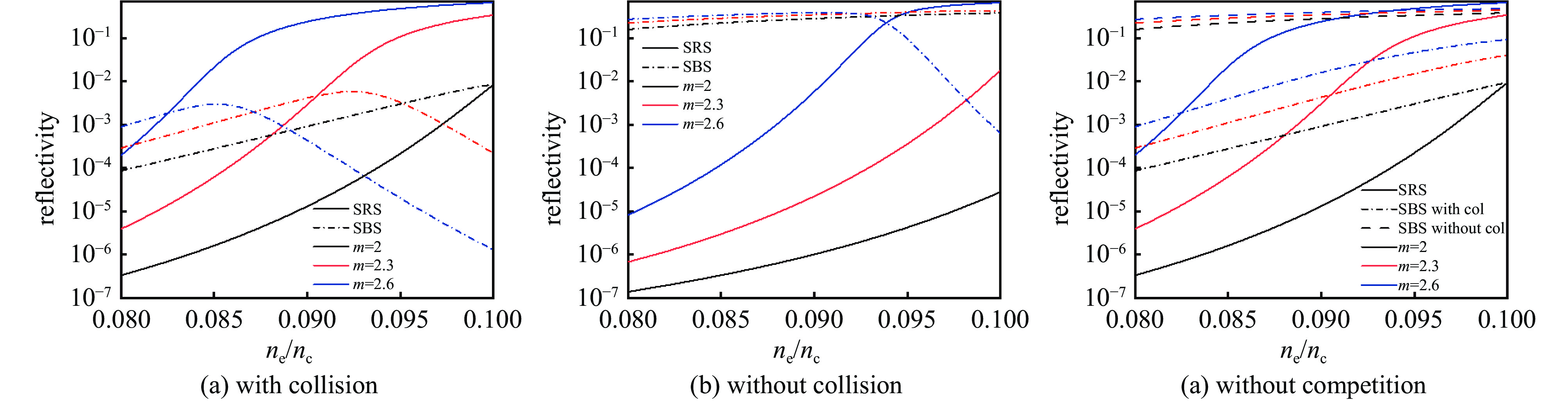 Five-wave coupling equations describing the nonlinear interactions among the pump laser, scattered light, Langmuir wave, and ion acoustic wave were numerically solved. A super-Gaussian electron distribution function was employed to incorporate the Langdon effect, while ion-ion collision effects were included through modifications to the ion susceptibility. The dispersion relations and damping characteristics of both electron plasma waves (EPWs) and ion acoustic waves (IAWs) were analyzed in detail.