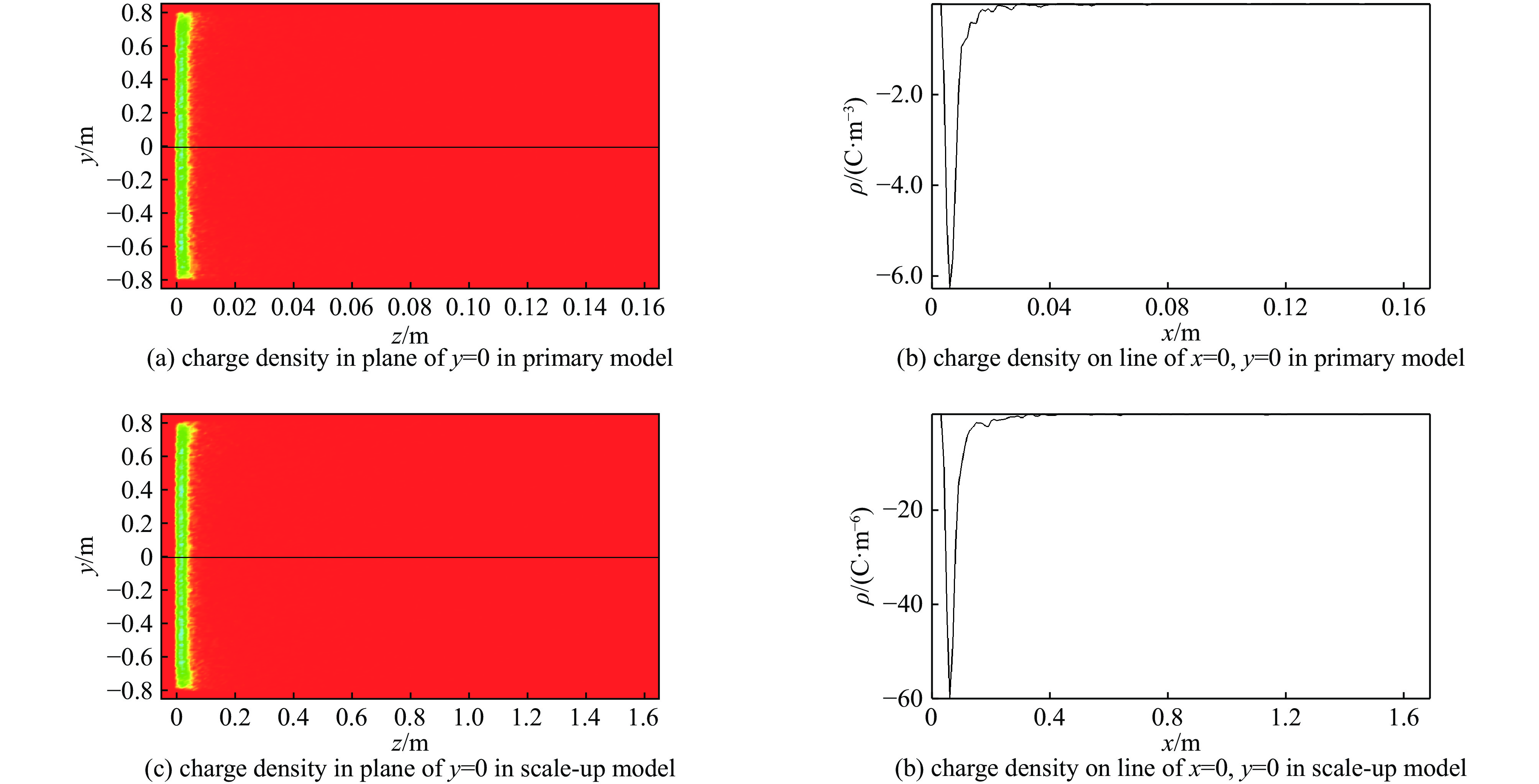 The original and scaled-up models exhibited identical spatial distributions of electromagnetic fields and charge densities. Specific validation results include: Peak electric fields decreased from 2.0 MV/m (original) to 200 kV/m (scaled-up); peak magnetic fields reduced from 0.8×10−3 T (original) to 0.8×10−4 T (scaled-up); and charge densities maxima dropped from 6.0×10−3 /m3 to 6.0×10−5 /m3. Waveform shapes for currents and fields remained unchanged across models. These results all adhere to the scaling laws.