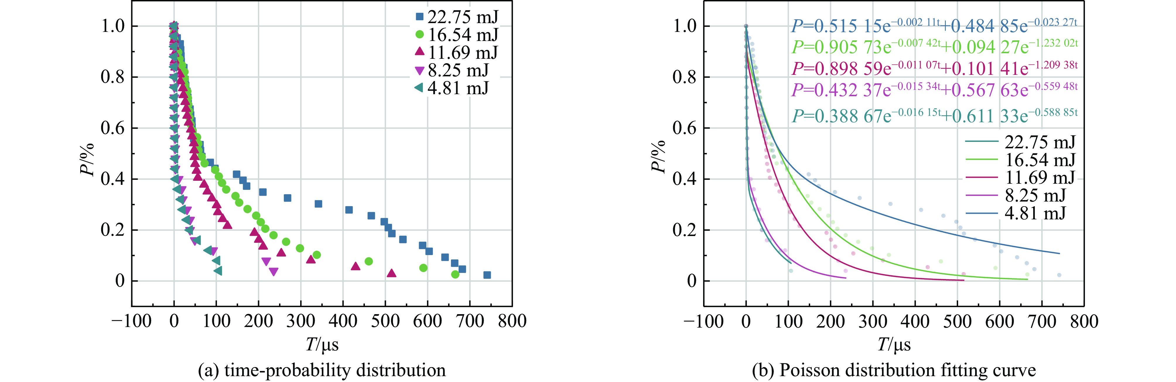 The mechanism of laser-induced solar array discharge was analyzed based on laser-induced plasma theory and discharge mechanisms within the low earth orbit (LEO) plasma environment. Guided by this theoretical framework, the experimental parameters for the laser-induced spacecraft solar array discharge test were determined. The experiment analyzed the probability of discharge induced by a 532 nm laser at different energy levels and acquired discharge duration data. Probability-time distribution curves were established, and the probability functions for discharge duration under different laser energies were obtained by fitting with a double Poisson distribution. Furthermore, a comparative study was conducted on the peak discharge current and the duration probability functions induced by 532 nm and 266 nm wavelength lasers at the same energy level.