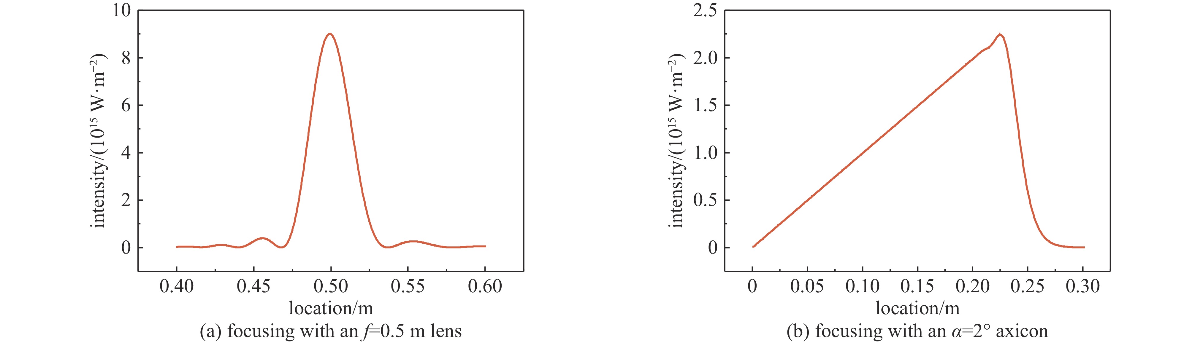 By comparing the intensity at focus and the depth of focus of an f = 0.5 m focal lens and an axicon, an axicon with a bottle angle of 2° could effectively reduce laser intensity at focus and increase the depth of focus. In this work, a pulsed 1064 nm laser was used as pump source, pressurized methane was used as Raman medium, and an axicon with a bottle angle of 2° was used to focus pump laser. Pressure of methane, pump laser divergence angles and diameter of pump beam were optimized to achieve the maximum conversion efficiency.