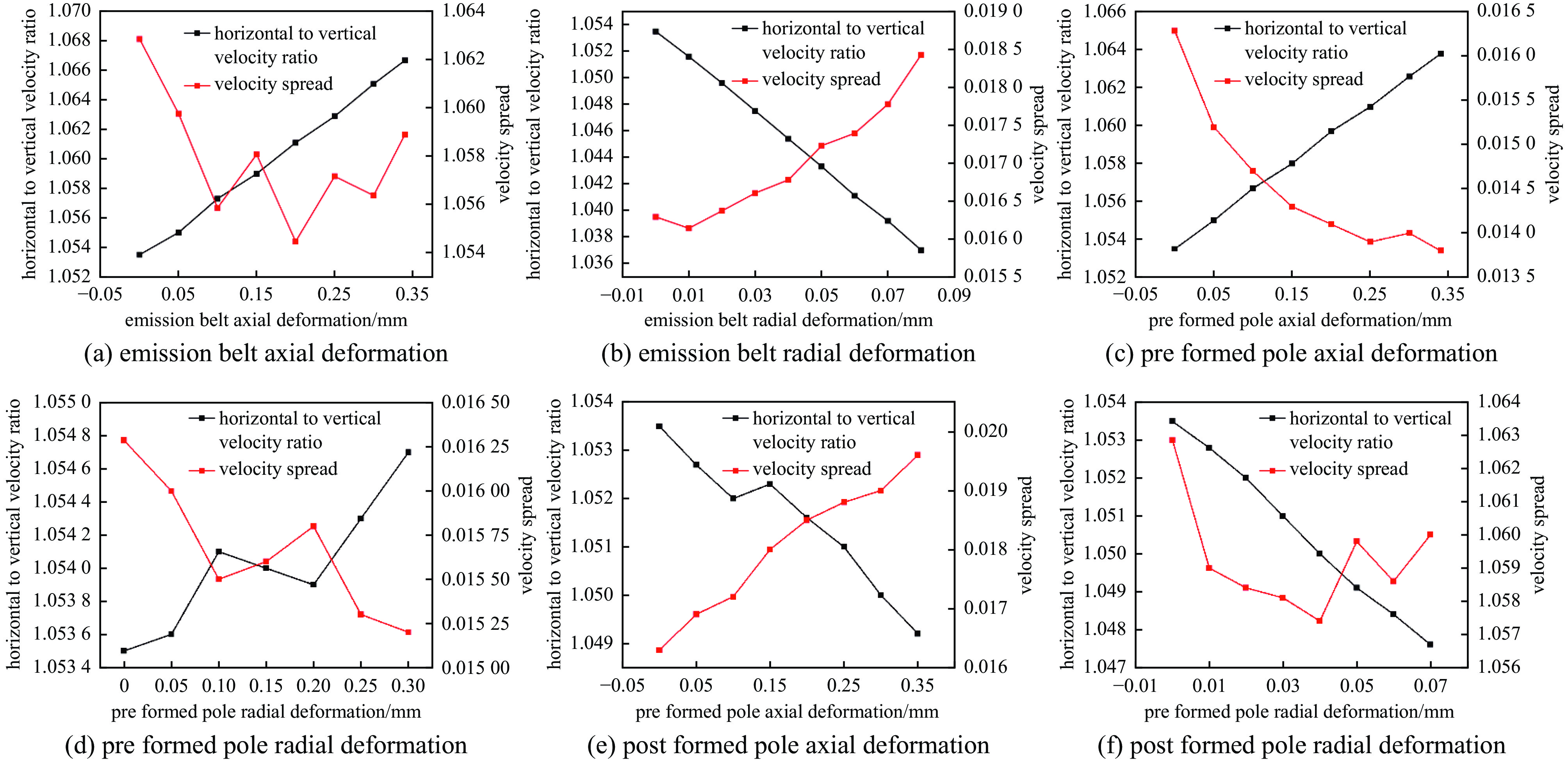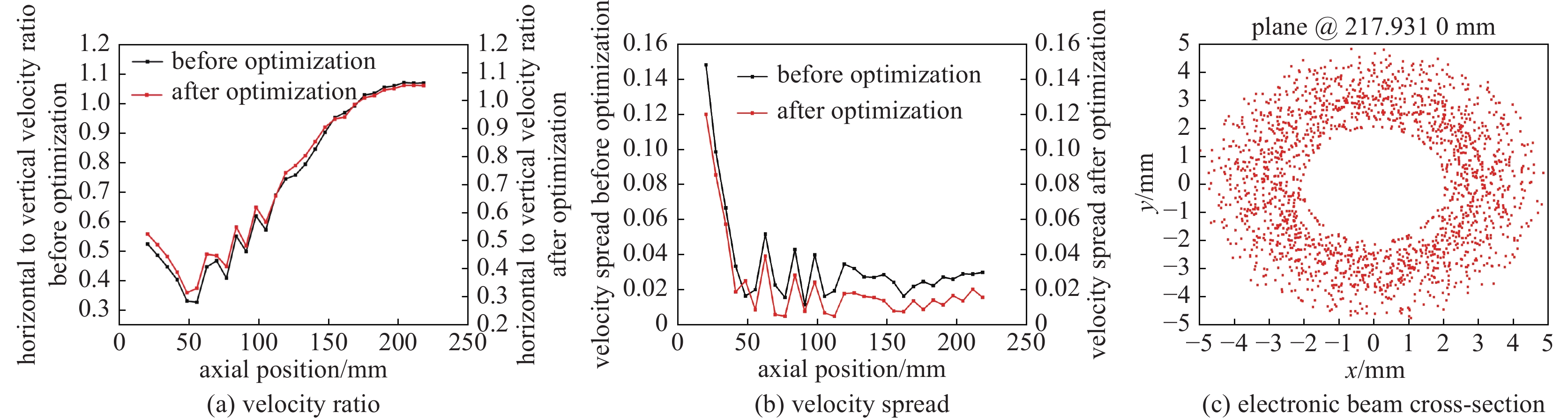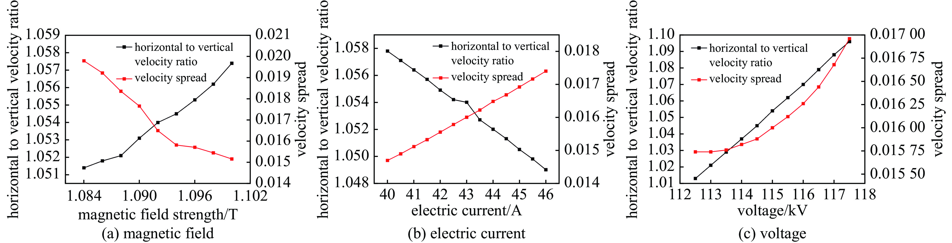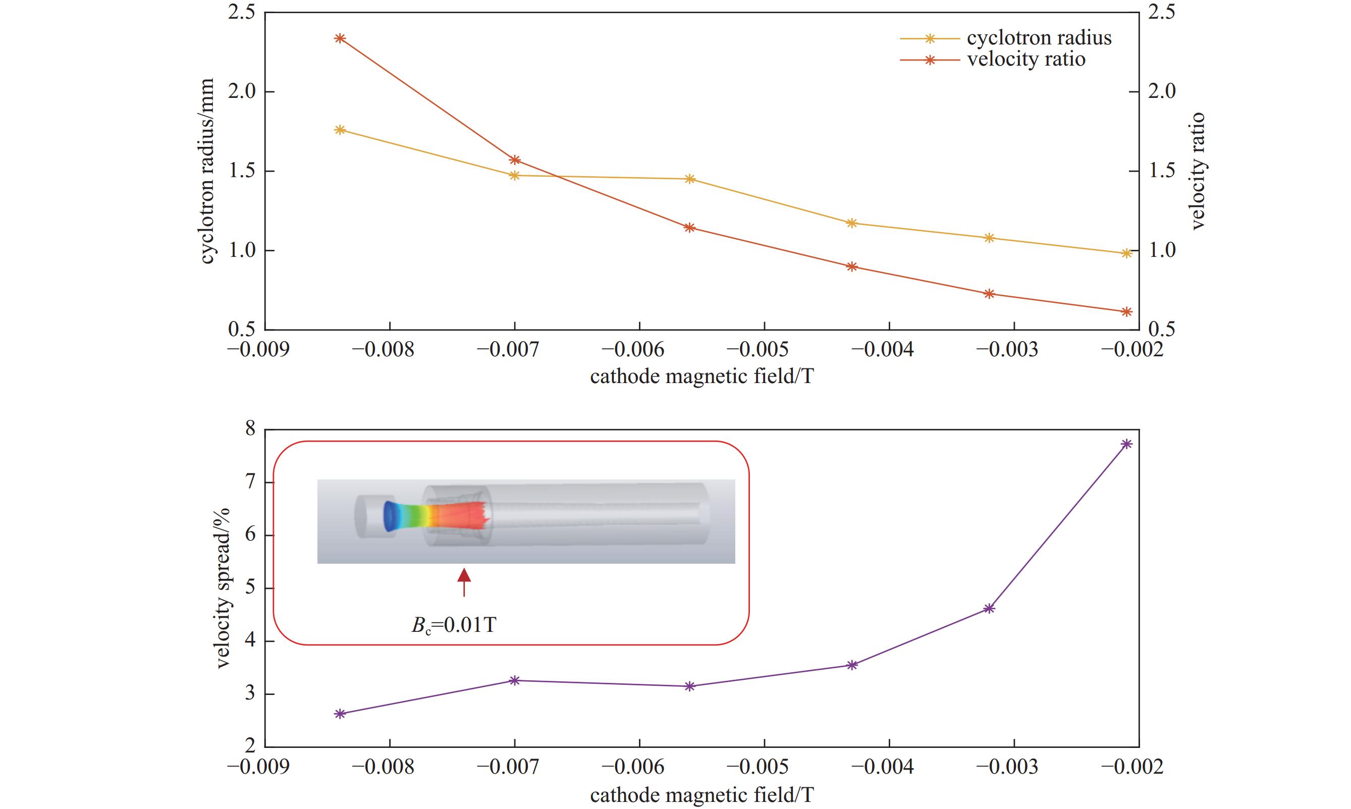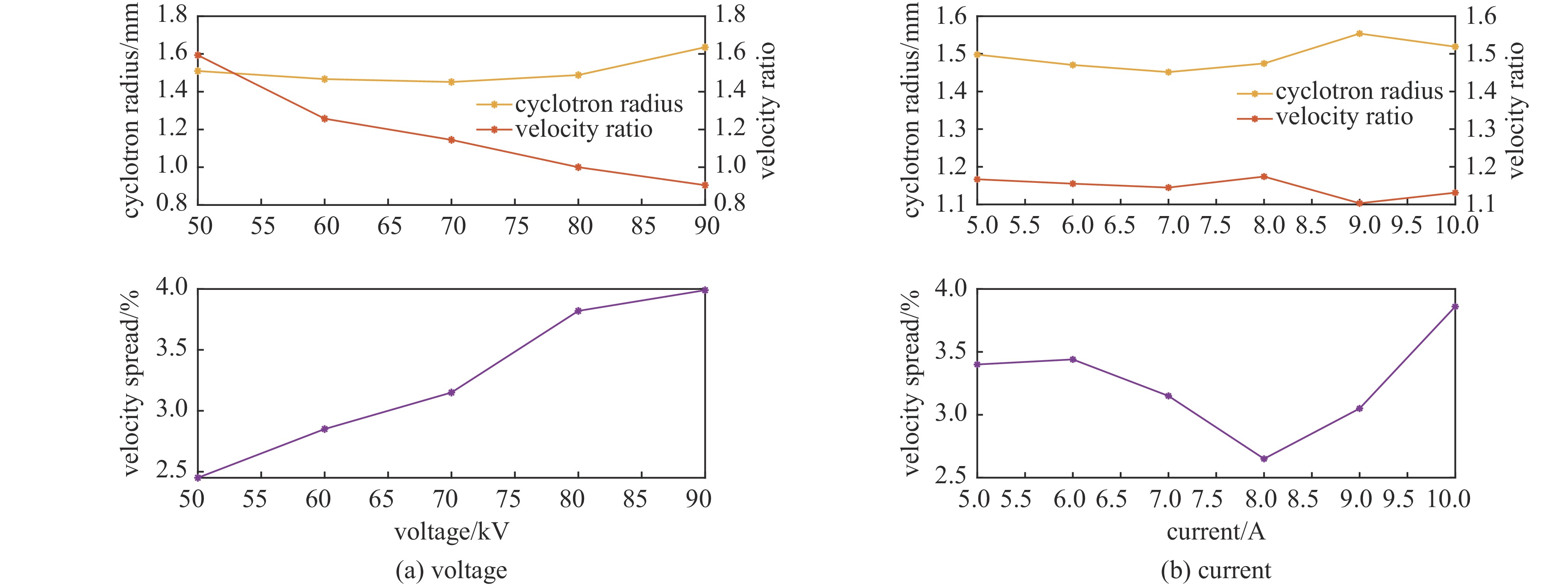 As the absolute value of the cathode magnetic field increases, both the velocity ratio and the Larmor radius increase, while the velocity spread decreases. With an increase in voltage, the velocity ratio decreases, and the Larmor radius drops to a minimum at a certain point before rising again. Variations in current have limited impact on the Larmor radius and the transverse-to-longitudinal velocity ratio; however, the electron-wave interaction efficiency reaches its maximum at the optimal operating current.