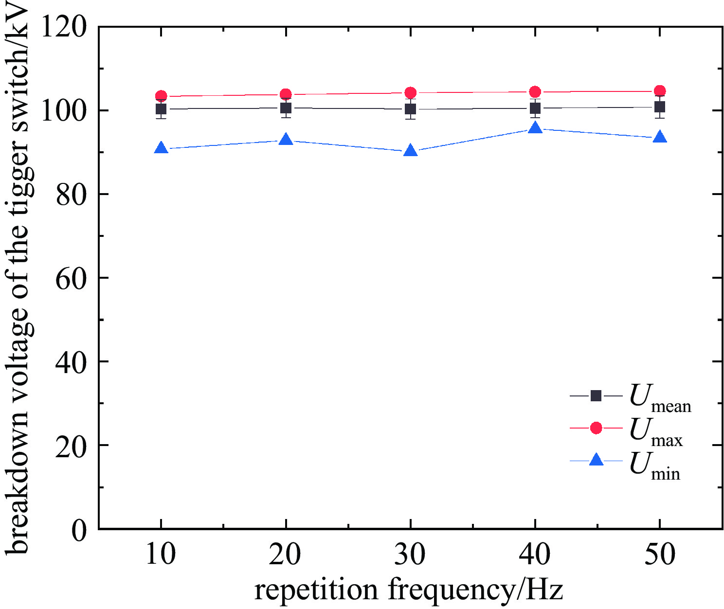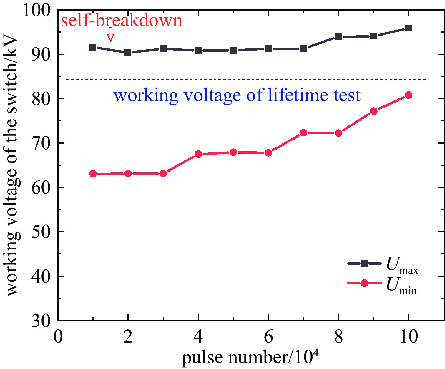 Experimental results demonstrate that, using SF6 as the working gas at a pressure of 0.6 MPa, the maximum operating voltage of the triggered switch reaches 90 kV. Under conditions of 84 kV operating voltage, 20 Hz repetition frequency, 500 pulses per burst, and without gas replacement, the switch was tested continuously for 100,000 pulses. Only one self-breakdown incident occurred during this period, resulting in a self-breakdown rate of less than 0.01‰.
