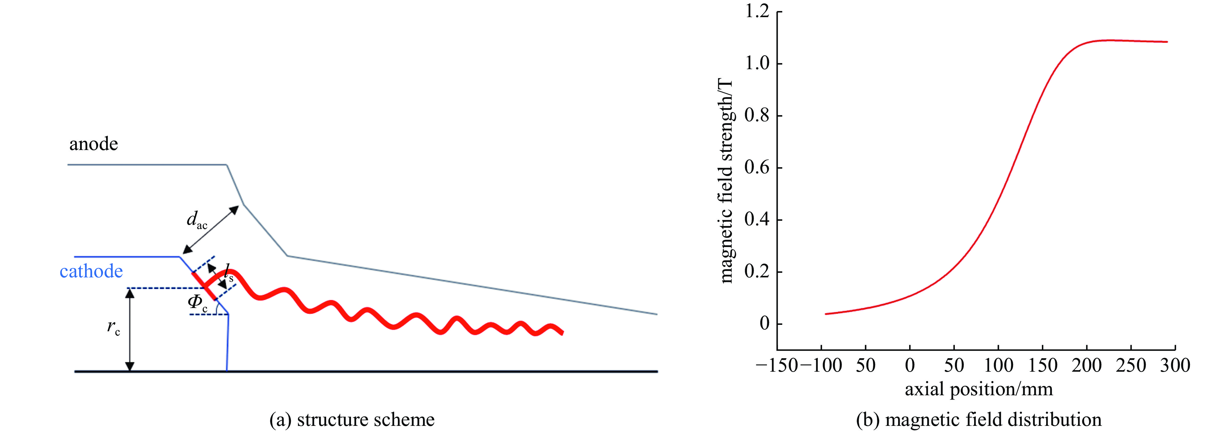 The novel electron gun scheme introduces a curved cathode structure to reduce the velocity spread of the electron beam, while effectively increasing the cathode emission area and reducing the cathode emission density.