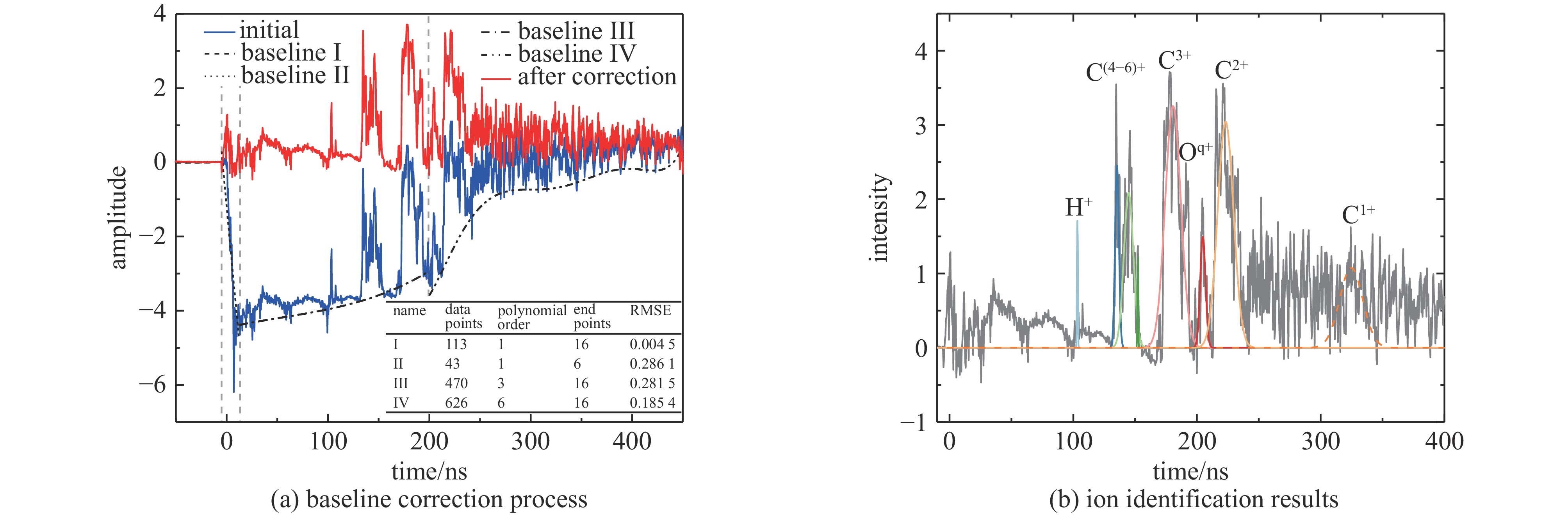 The results show that intense EMP generated at the moment of laser-target interaction couple into the diagnostic system through the transmission cables, inducing baseline drops up to −5 V, which gradually recover to the normal level after approximately 200 ns. Polynomial orders are assigned region-specifically: first-order for Instantaneous interference I and II region, third-order for continuous interference region, and sixth-order for stable recovery region. Model accuracy is validated through root mean square error (RMSE). After correction, previously obscured TOF peaks for protons and carbon ions (C1+ to C6+) became clearly identifiable, enhancing the detection of low-energy ions.