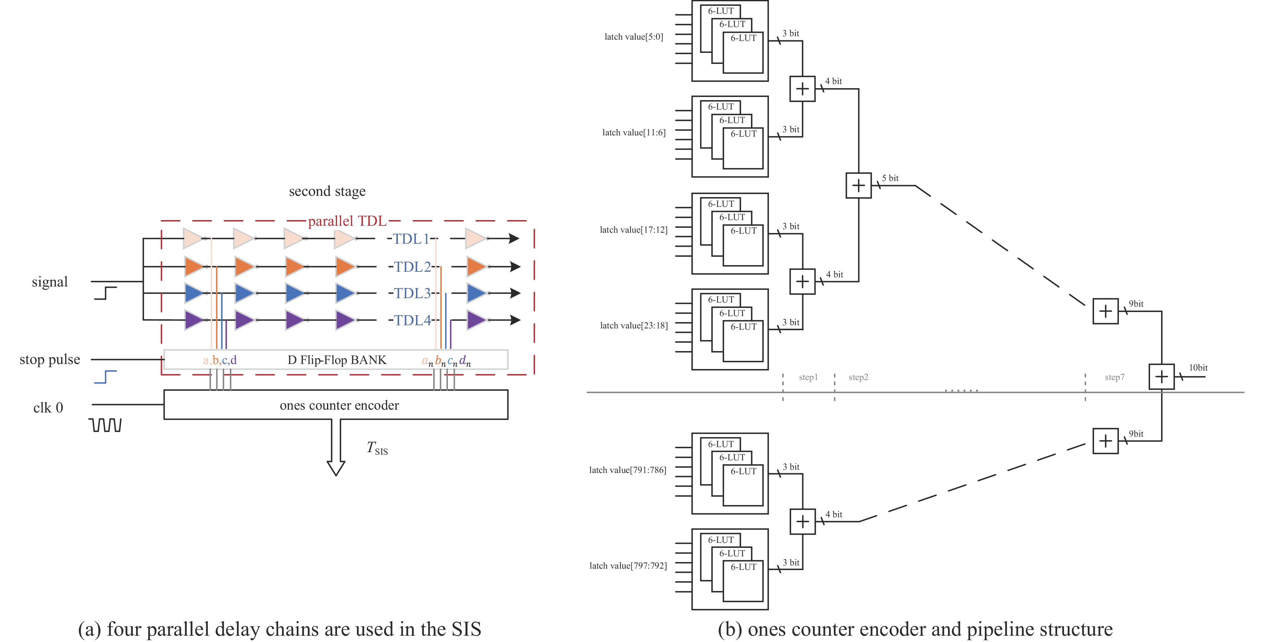 The experimental evaluation demonstrated that a time resolution better than 4 ps was achieved. The measured differential nonlinearity (DNL) was in the range of −1 least significant bit (LSB) to +7 LSB, while the integral nonlinearity (INL) ranged from −2 LSB to +14 LSB. Compared with conventional architectures, the proposed scheme shortens the delay chain length by several times at the same operating frequency, and achieves a lower frequency with the same chain length.