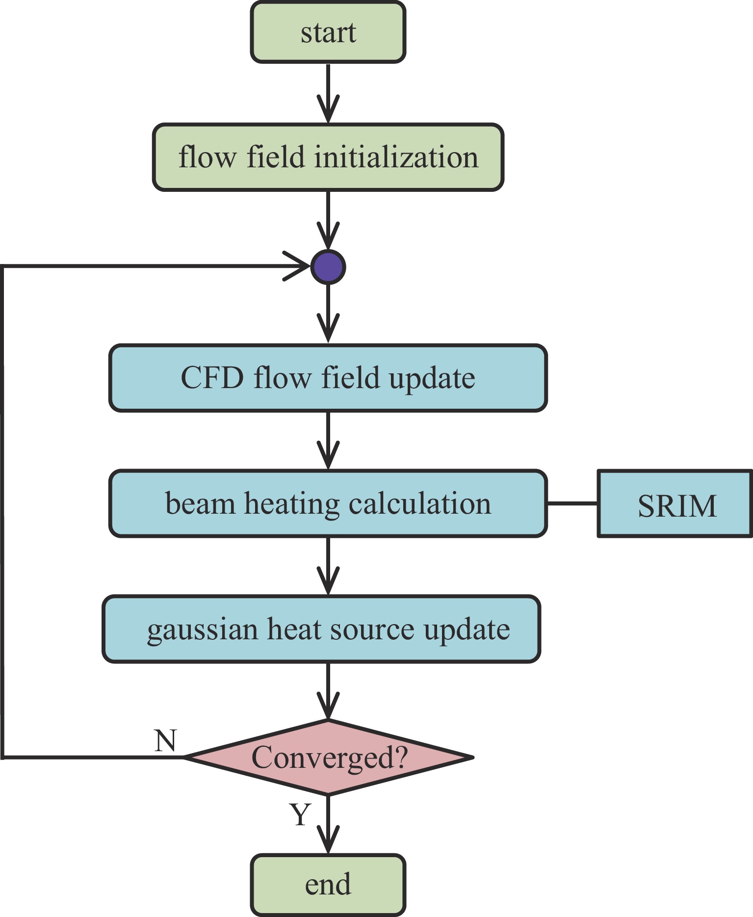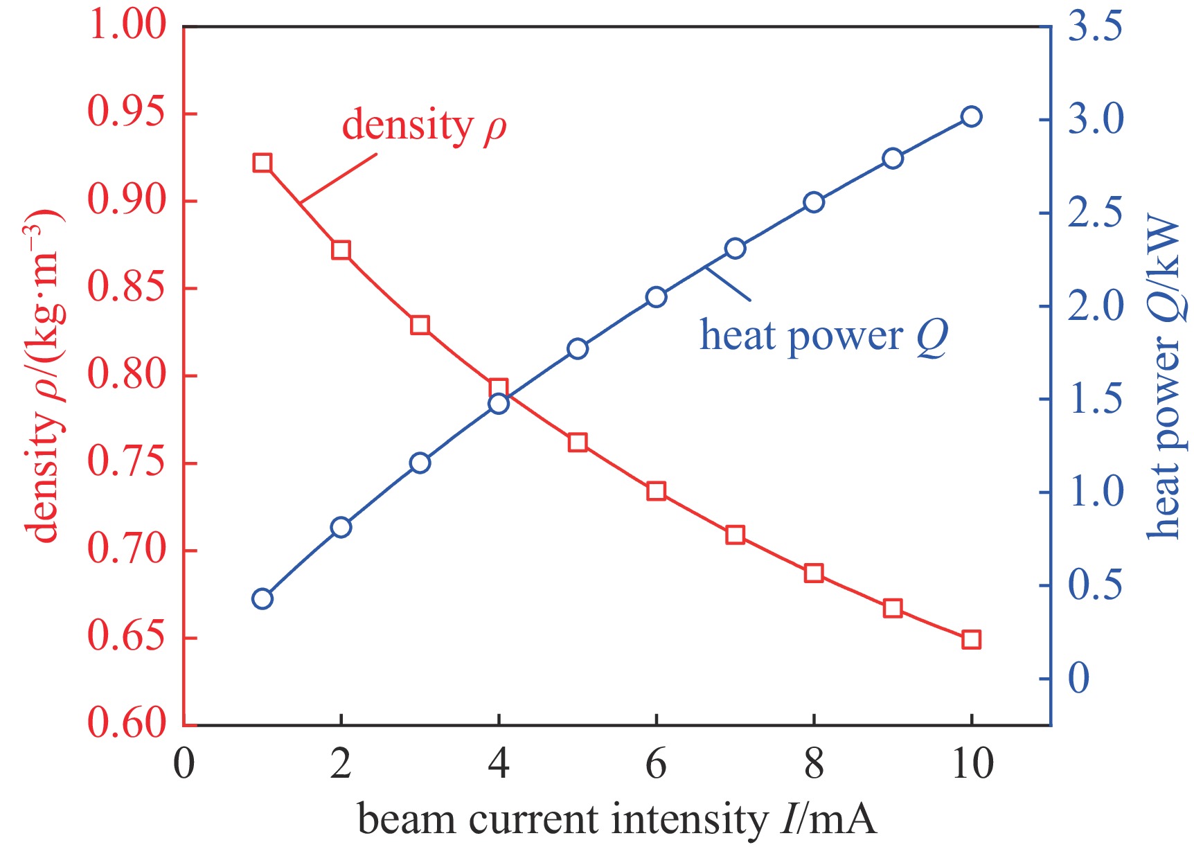 The energy straggling calculations show that the contribution from the gas is very small, with the metal window being the primary source of energy straggling for incident ions. The simulation results indicate that as the beam current increases, the heating power rises gradually, while the density in the heated region decreases rapidly. Increasing the inlet flow velocity enhances the heat dissipation capacity and reduces the density drop effect caused by beam heating.