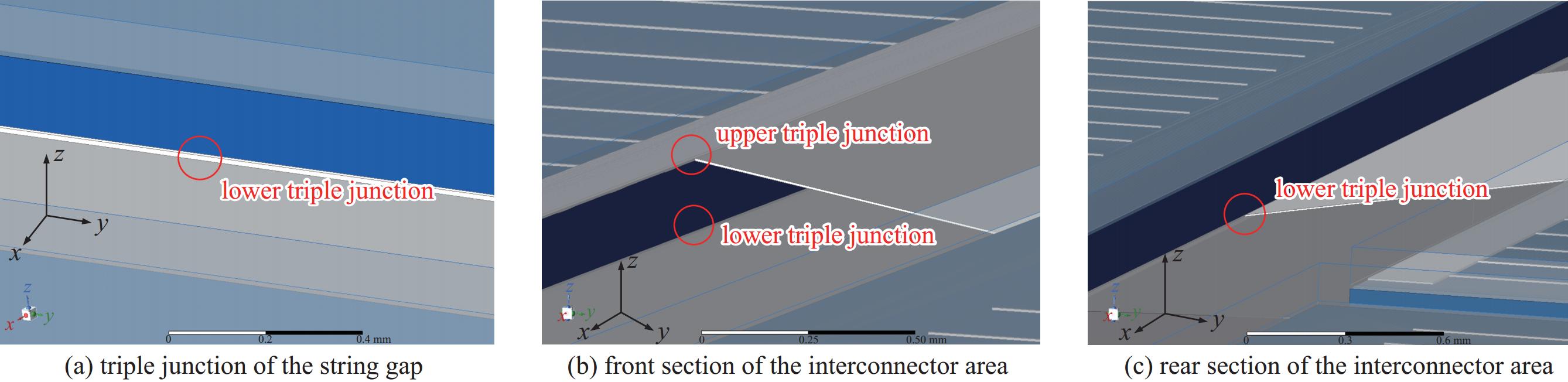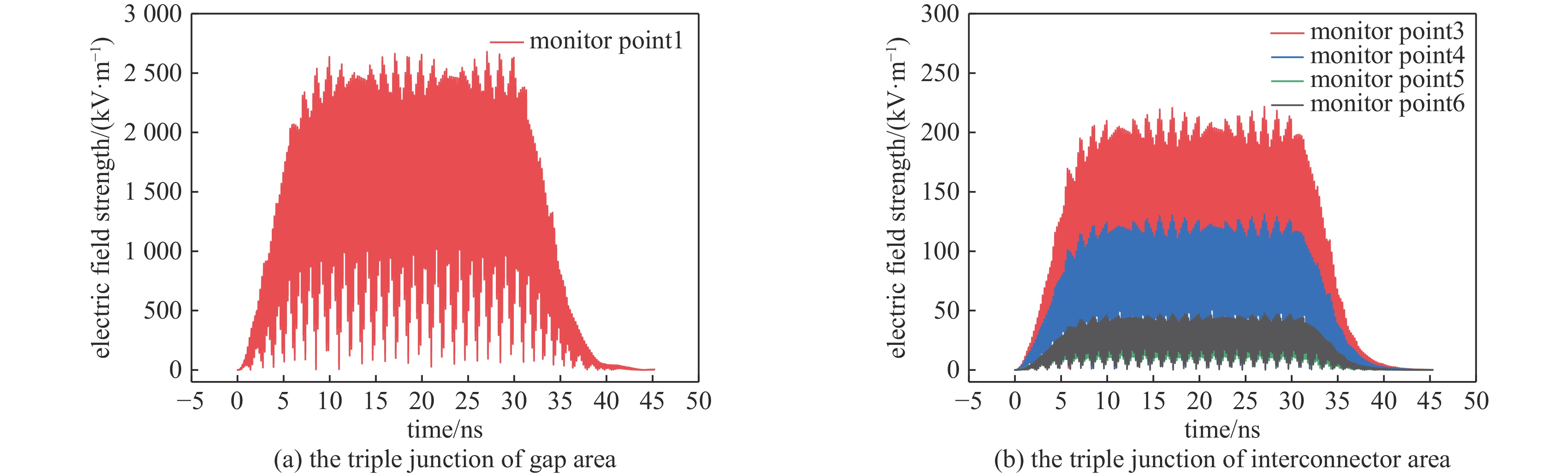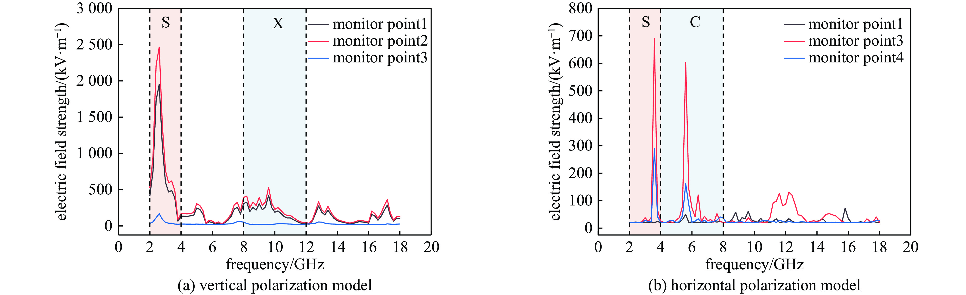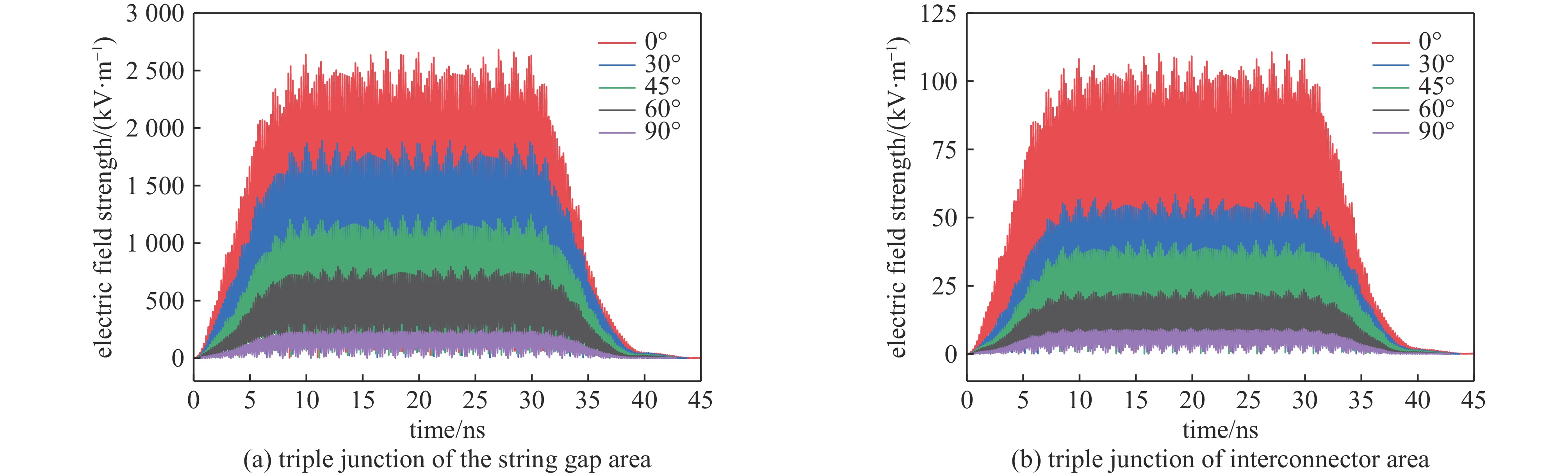 (1)Within the frequency range of 2–18 GHz, vertically polarized S-band microwave irradiation is most likely to induce discharge damage to the solar cell array, with the induced electric field at the triple junction in cell string gaps being much higher than that at interconnect gaps. (2) Under microwave irradiation, the solar cell samples exhibit intense transient electric fields; in the case of vertical polarization, the induced field is mainly concentrated in the cell string gaps, near the busbars, and along the cell edges. (3) The steady peak of the induced electric field at the triple junction decreases with increasing microwave incidence angle and increases with higher microwave power density. (4) The rise and fall times of the microwave pulse have no significant effect on the induced electric field magnitude. (5) The electric field in the space around the cell string gap gradually decreases from the gap center toward the outer region.