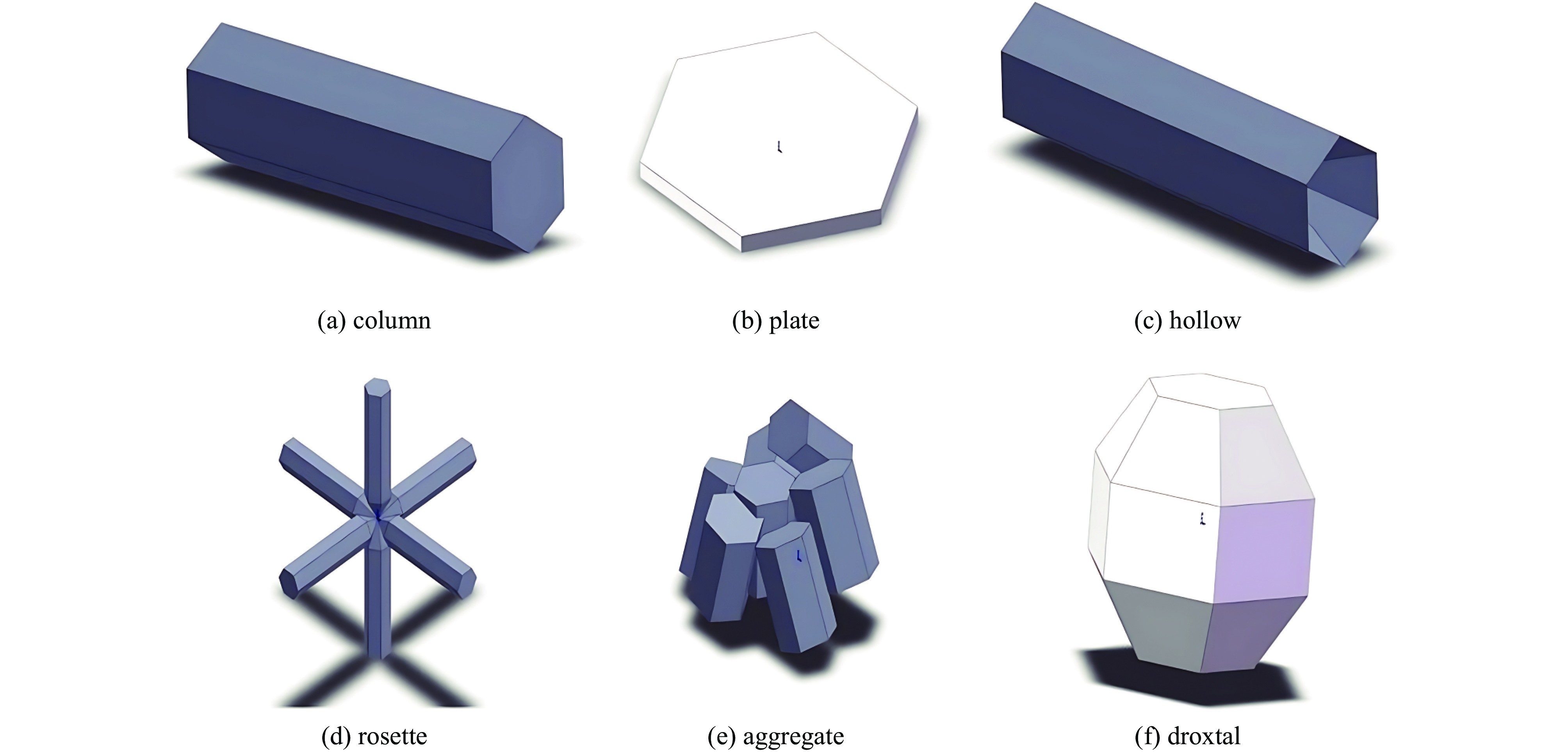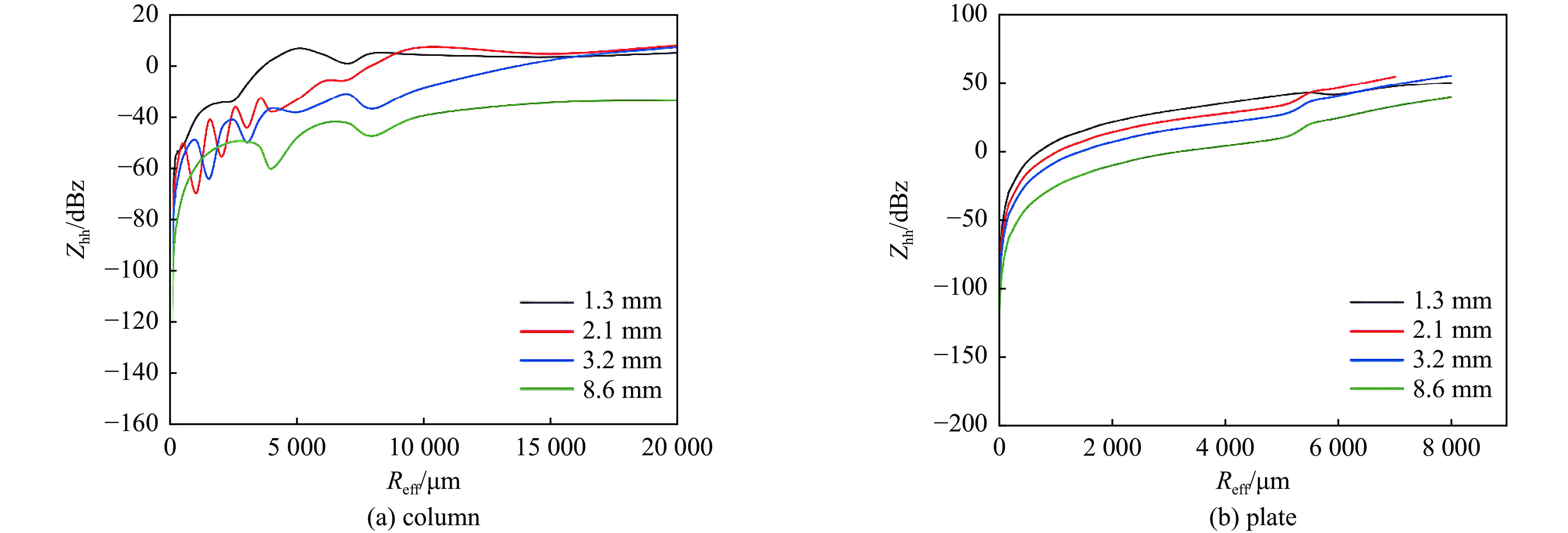 1)The reliability of DDA was systematically validated across the 35–220 GHz range. Calculation errors for backscattering cross-sections were ≤1.5 dB for all particles except highly random aggregates. 2) Radar reflectivity factor showed a coupled wavelength dependence: small particles (equivalent radius <100 μm) were wavelength-insensitive (<1 dB difference), while large particles (>100 μm) exhibited significant shape-dependent resonance. The equivalent radius corresponding to resonance extrema increased with wavelength. 3) Characteristic ranges of ZDR and LDR for the six ice crystal types were quantified. Hexagonal plates showed the widest ZDR range (9 dB to –9 dB), while axisymmetric particles exhibited stable LDR values (–40 dB to –50 dB).