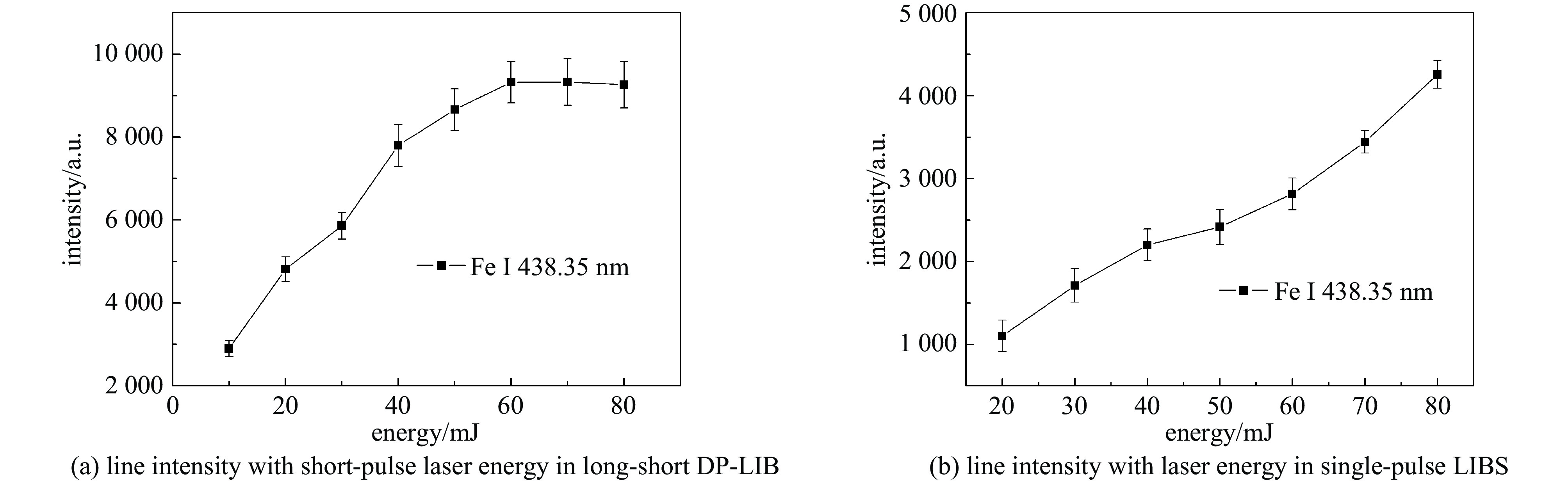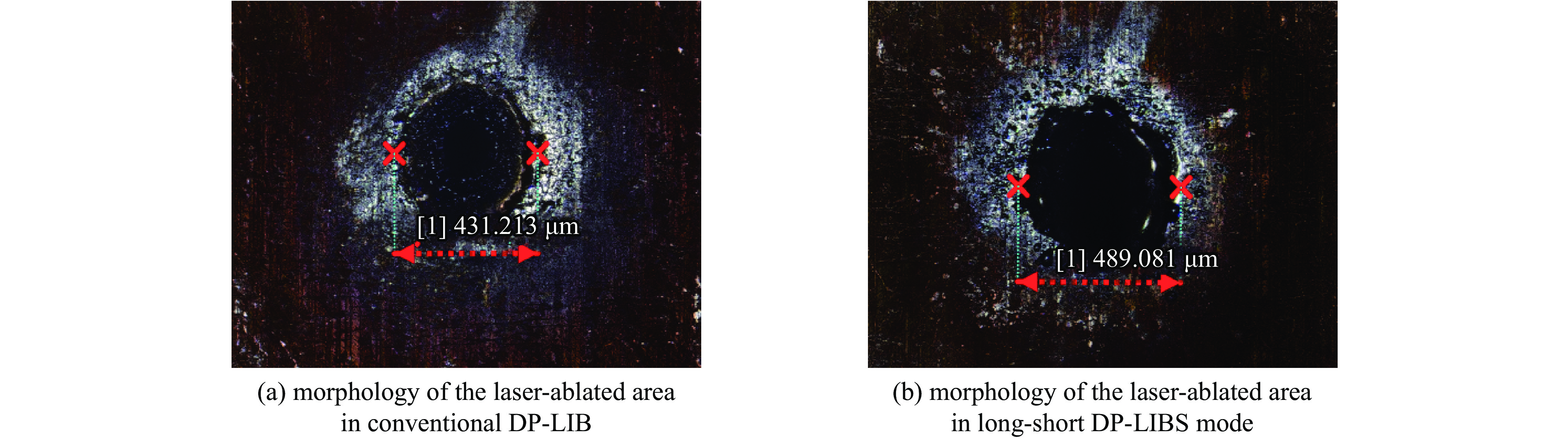 In the conventional DP-LIBS configuration, spectral enhancement is more sensitive to the energy variations of the second pulse than that of the first pulse. In the long-short pulse scheme, increasing the energy of the long-pulse laser facilitates sample heating and surface modification, thereby enhancing spectral intensity. However, excessive long-pulse laser energy might cause sample melting and material ejection, which in turn diminishes the ablation efficiency of the subsequent short-pulse laser and reduces the overall spectral intensity. Further analysis of the ablation morphology reveals that the conventional collinear DP-LIBS tends to produce deeper ablation craters, whereas the long-short collinear DP-LIBS is more likely to generate larger ablation craters.