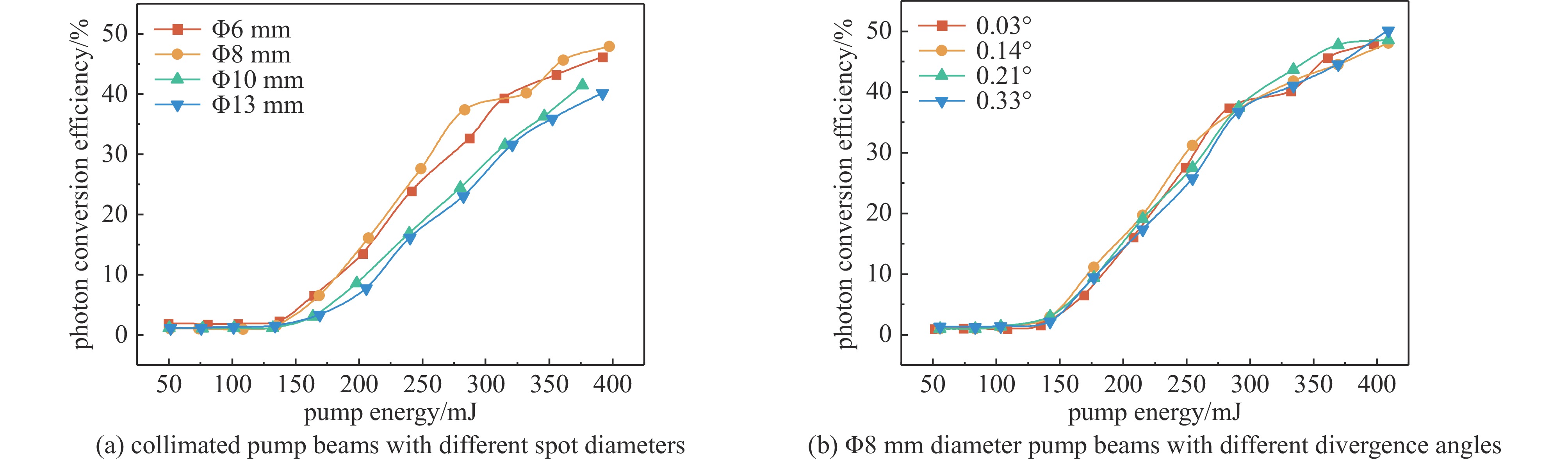 By the comparison of intensity at focus and depth of focus of f = 0.5 m focal lens and axicon, axicon with bottle angle of 2° could effectively reduce laser intensity at focus and increase the depth of focus. In this work, a pulsed 1064 nm laser was used as pump source, pressurized methane was used as Raman medium, and axicon with bottle angle of 2° was used to focus pump laser. Pressure of methane, pump laser divergence angles and diameter of pump beam were optimized to achieve the maximum conversion efficiency.