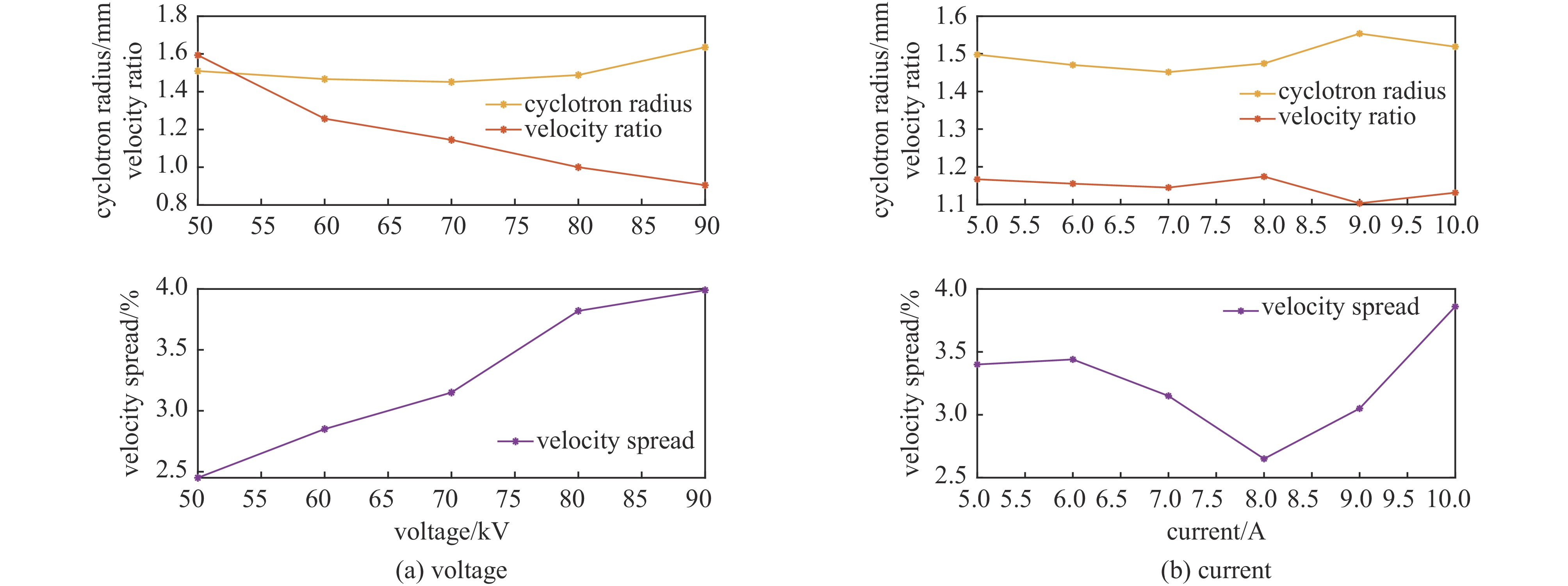 As the absolute value of the cathode magnetic field increases, both the velocity ratio and the Larmor radius increase, while the velocity spread decreases. With an increase in voltage, the velocity ratio decreases, and the Larmor radius drops to a minimum at a certain point before rising again. Variations in current have limited impact on the Larmor radius and the transverse-to-longitudinal velocity ratio; however, the electron-wave interaction efficiency reaches its maximum at the optimal operating current.