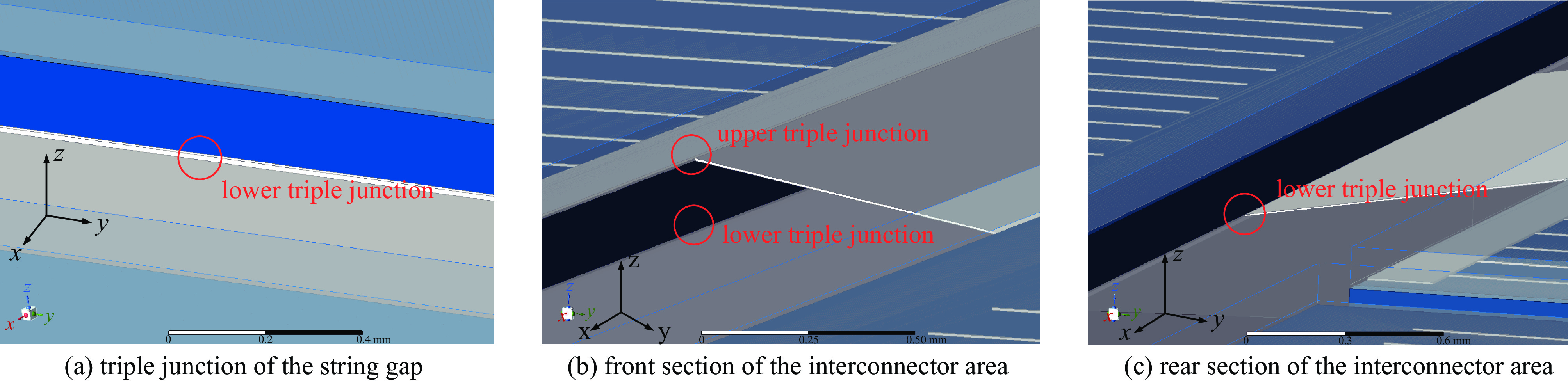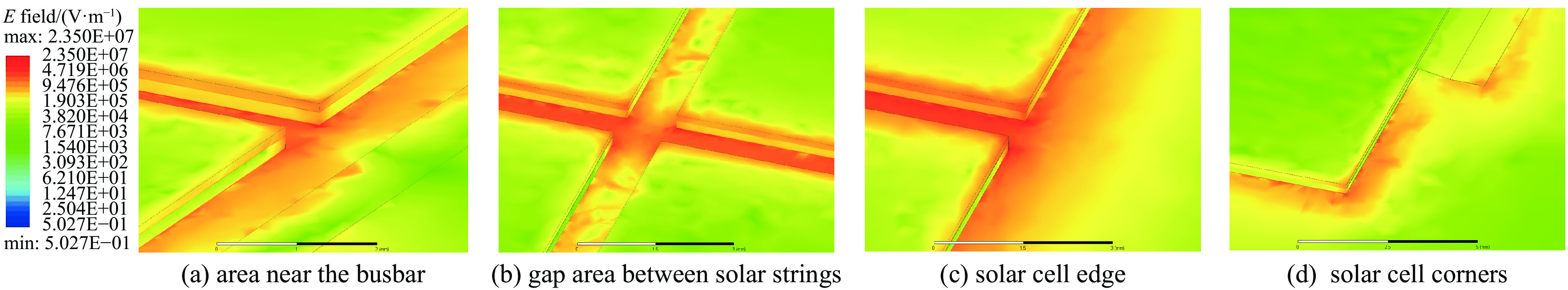 (1)Within the frequency range of 2–18 GHz, vertically polarized S-band microwave irradiation is most likely to induce discharge damage to the solar cell array, with the induced electric field at the triple junction in cell string gaps being much higher than that at interconnect gaps. (2) Under microwave irradiation, the solar cell samples exhibit intense transient electric fields; in the case of vertical polarization, the induced field is mainly concentrated in the cell string gaps, near the busbars, and along the cell edges. (3) The steady peak of the induced electric field at the triple junction decreases with increasing microwave incidence angle and increases with higher microwave power density. (4) The rise and fall times of the microwave pulse have no significant effect on the induced electric field magnitude. (5) The electric field in the space around the cell string gap gradually decreases from the gap center toward the outer region.