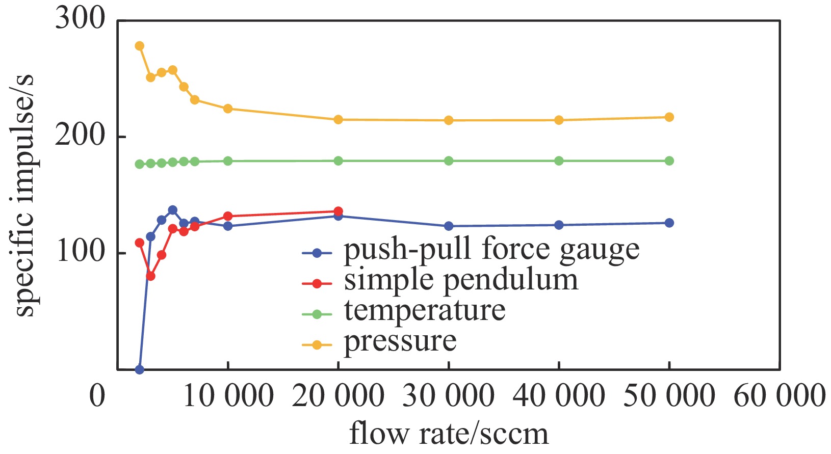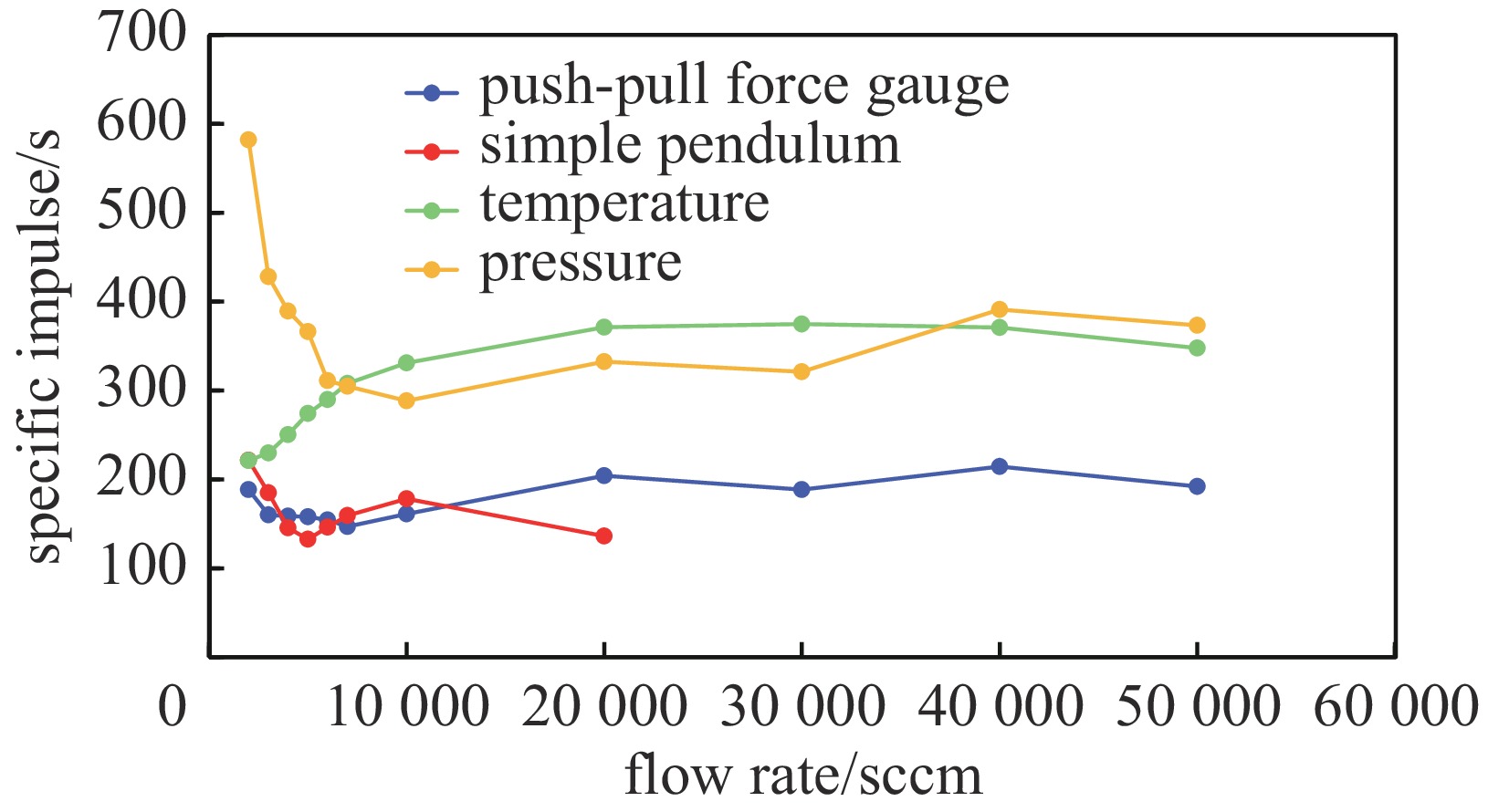 In cold gas experiments, thrust increased almost linearly with helium flow; push-pull force gauge and pendulum data were highly consistent, while temperature- and pressure-based calculated values were higher. In discharge experiments, thrust still increased with flow (slower at high flow), specific impulse remained stable (slight drop at high flow), and temperature- and pressure-based values showed better consistency. All four methods performed well within the 0-600 mN thrust range, with indirect methods consistent with direct measurements.