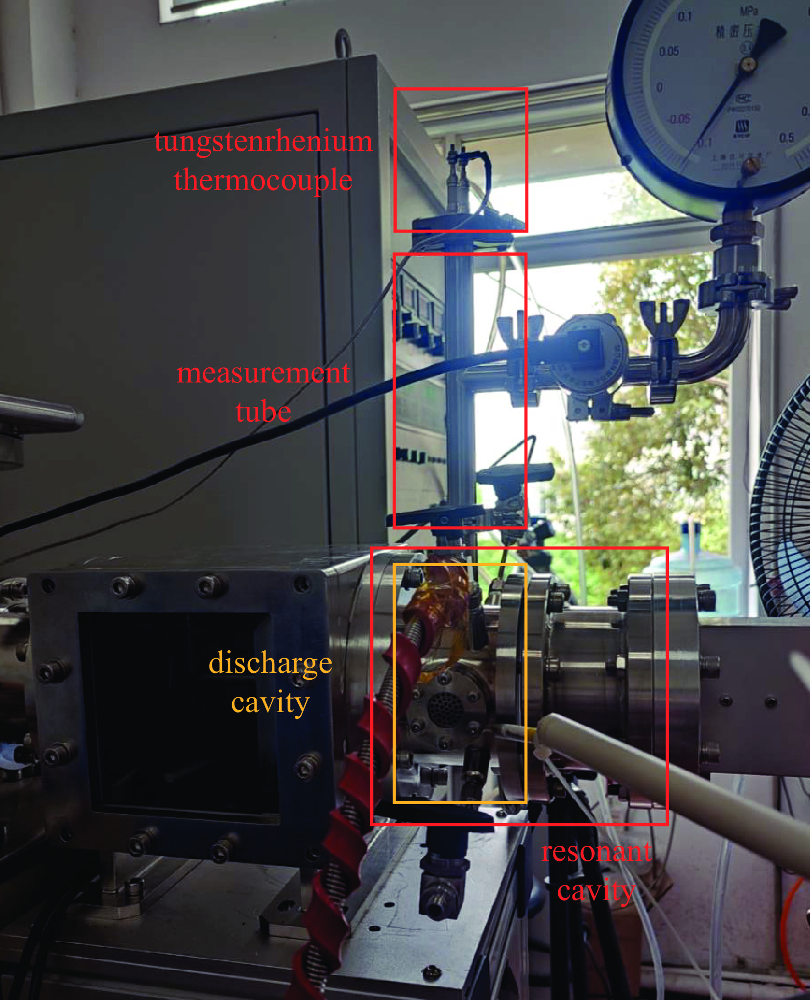Four thrust measurement methods were developed: 1) Modified NH-2 electronic push-pull force gauge (2 N range, 0.001 N resolution) with a 5.5 cm metal target and 3D-printed bracket; 2) Pendulum thrust meter using an eddy current displacement sensor (2 mV/μm sensitivity) to measure small displacements, with force analysis under small angles (<10°); 3) Thrust calculation based on resonant cavity gas temperature (measured by WRe26 thermocouple, 0-1800 ℃ range) using adiabatic process and ideal gas equations; 4) Thrust calculation based on resonant cavity pressure (measured by a precision pressure gauge) via derived formulas. Experiments used a 1500 W 2.45 GHz magnetron microwave source with helium as the working fluid, conducted under cold gas (microwave off) and discharge (microwave on) conditions.
