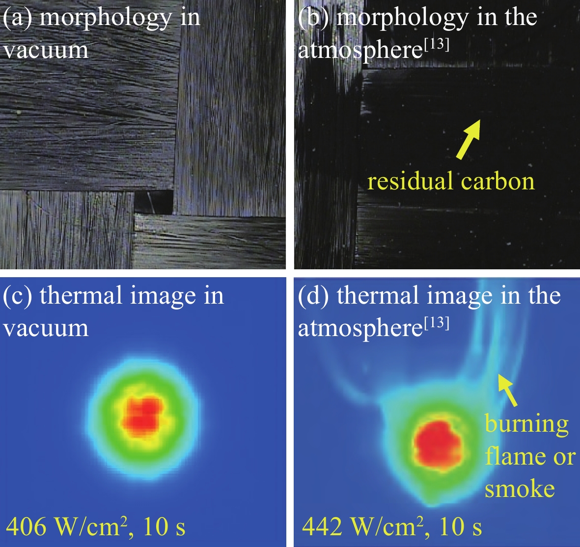 Experimentally, laser was used as the heat source to design and perform thermal ablation tests on plain-woven CFRP under vacuum. An experimental system based on infrared and thermocouple temperature measurements was employed to record the transient temperature field on the irradiated surface and the temperature of the back surface. In terms of simulation, based on a fiber-yarn/matrix dual-phase micro-modeling strategy and combined with a finite element thermal analysis module and user-defined subroutines, a theoretical and numerical model for the thermal ablation of woven composites was developed.
