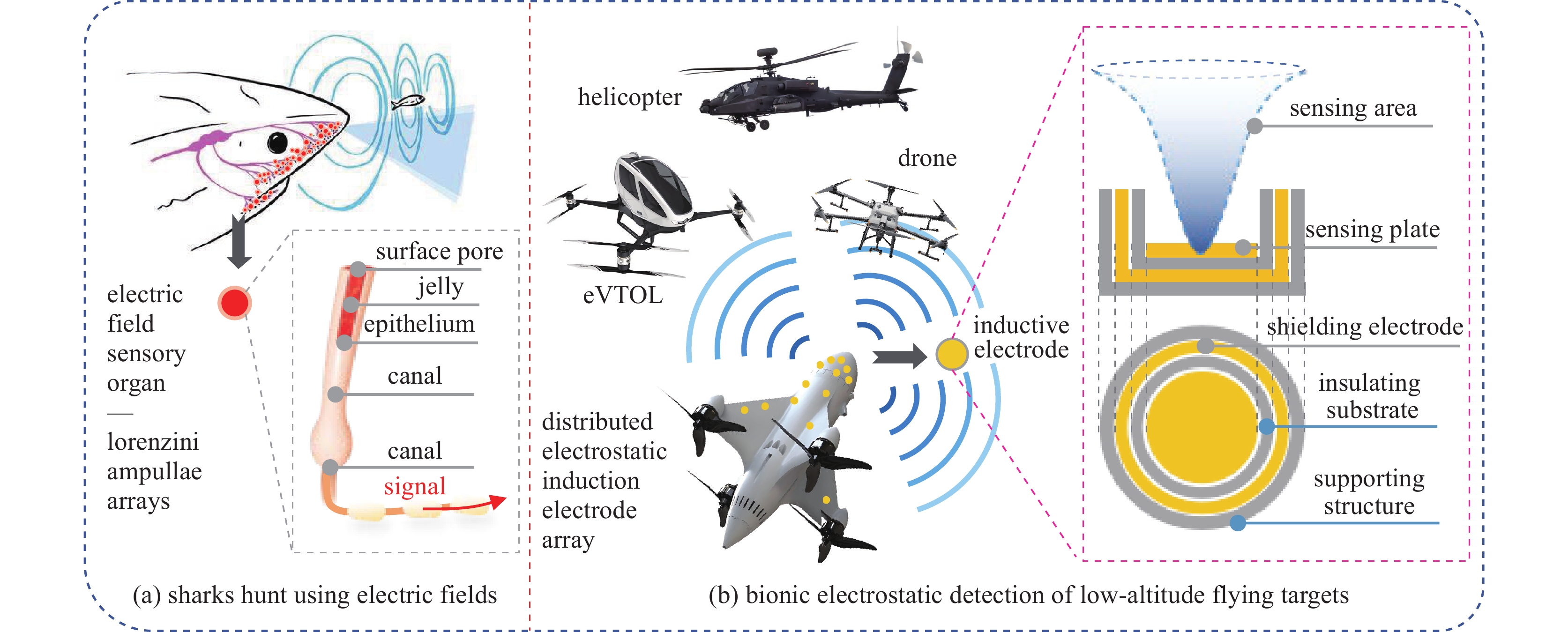 Aircraft accumulate electrostatic charges through triboelectric effects between blades or skins and atmospheric particles such as dust, ice crystals, or raindrops, as well as through jet charging from engine exhausts. These charges disturb the surrounding electrostatic field, which can be detected by electrostatic sensors. Previous studies have demonstrated trajectory and velocity detection using flat plates, cylindrical electrodes, vector field sensors, and even self-powered or deep learning–assisted approaches. Yet, such electrode arrays are typically bulky, aerodynamically intrusive, and unsuitable for low-altitude platforms. To address these gaps, this study introduces a bio-inspired electrostatic sensing approach.
