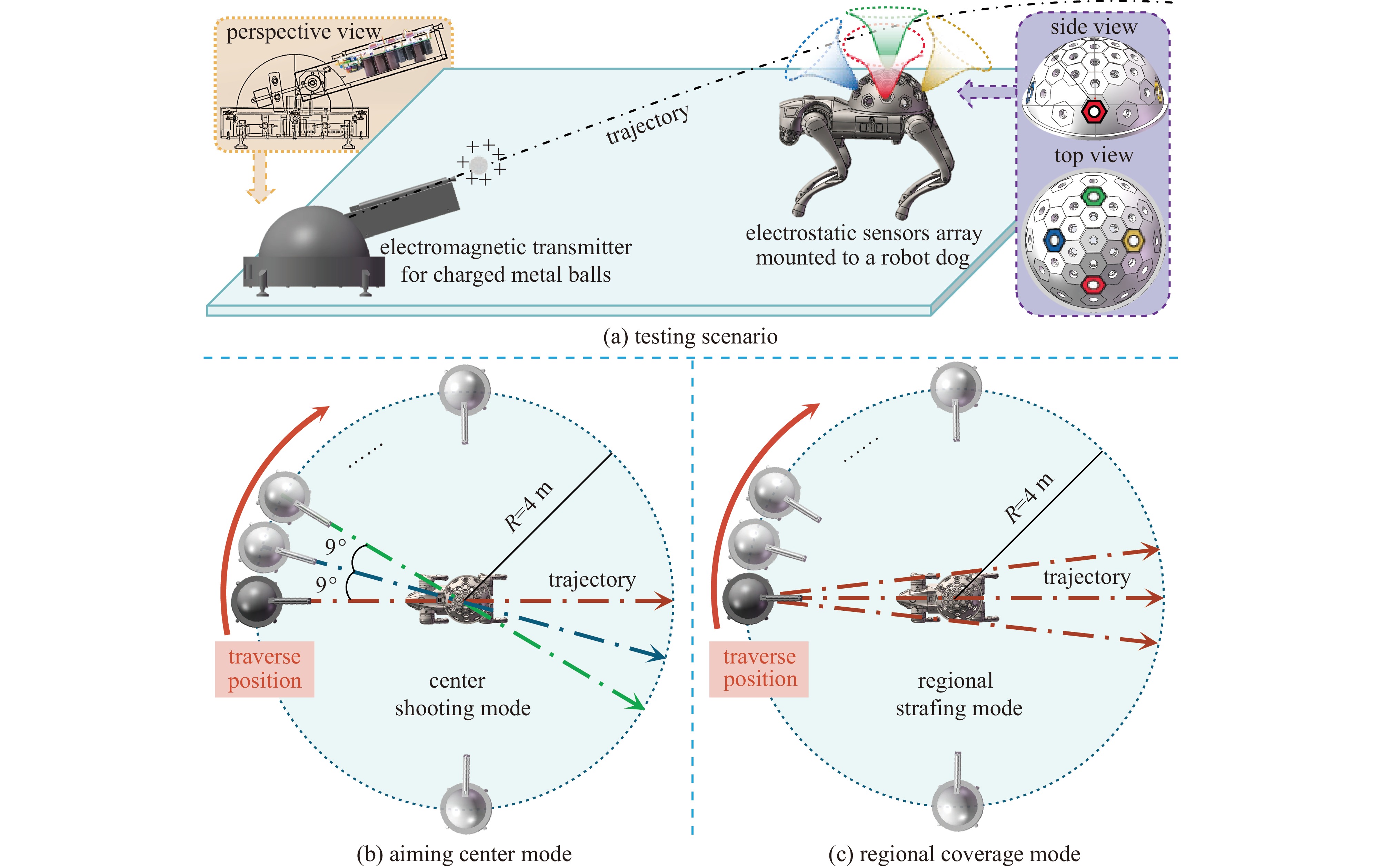 Inspired by sharks’ Lorenzini ampullae, a conformal hemispherical electrode array was deployed to provide directional diversity and enhance spatial resolution. Theoretical modeling examined the effects of electrode orientation, target distance, and velocity on induction signals. A laboratory system was constructed using an electromagnetic launcher and attitude control module to fire charged metal spheres within a 4 m arena. A robotic platform equipped with the hemispherical array collected signals under two modes: central crossing and regional coverage. A symbolic regression model is then trained on the dataset to reconstruct the trajectory direction of flying targets.