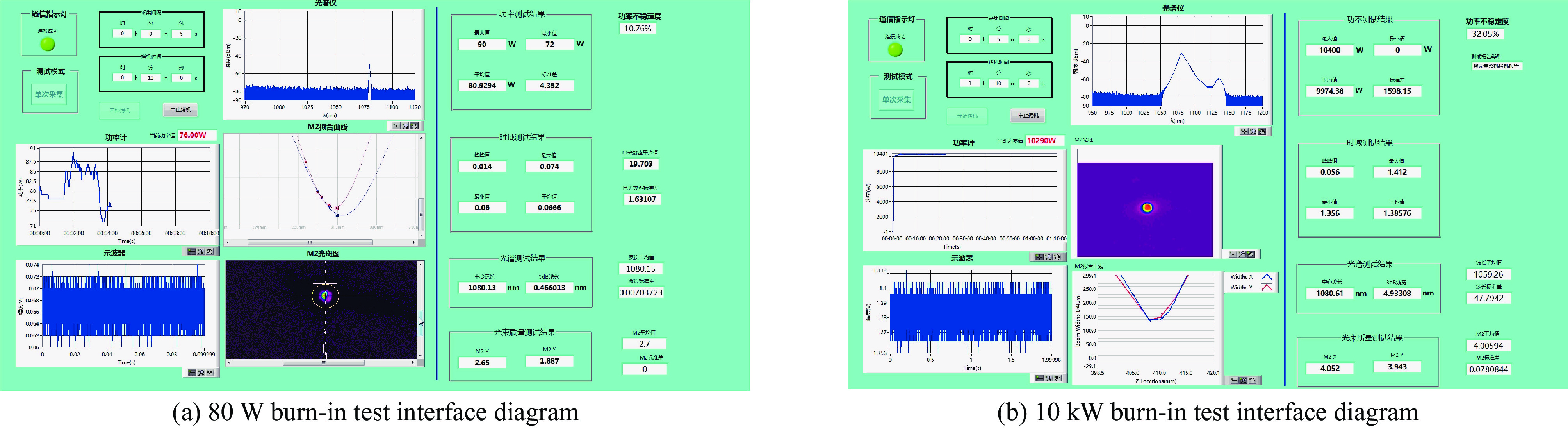 The system can adapt to the testing needs of fiber lasers with an output power range of 80 W to 10 kW. During testing, users only need to connect the fiber end cap of the laser under test to the system, and can start multi-parameter synchronous testing through the upper computer software without manual intervention in the optical adjustment link. After the test, the system can automatically complete the analysis and processing of raw data and generate a standardized test report. Verification experiments conducted with a 10 kW fiber laser as the test object show that the system has good operability, reliability, test repeatability, and technical feasibility.