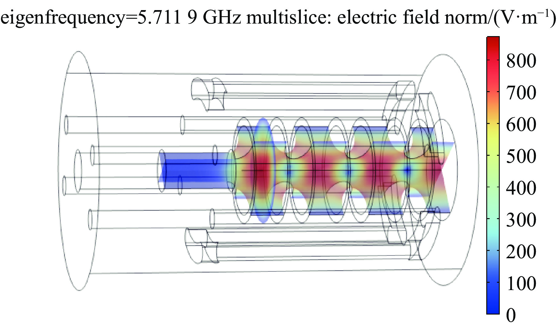 First, high-frequency electromagnetic simulations are carried out to obtain the designed resonant frequency of the vacuum cavity at 5.712 GHz and to calculate the surface electromagnetic loss power density. Based on these results, an equivalent boundary heat source model is established, and the external mechanical structure of the electron gun together with the cooling pipeline is modeled. By employing a fluid–solid coupling method, the non-uniform temperature distribution of the cavity under realistic cooling conditions is obtained. Subsequently, the solid mechanics interface is used to compute the thermally induced deformation of the cavity geometry, and the deformed structure is introduced into a secondary high-frequency simulation to evaluate the resulting resonant frequency drift.