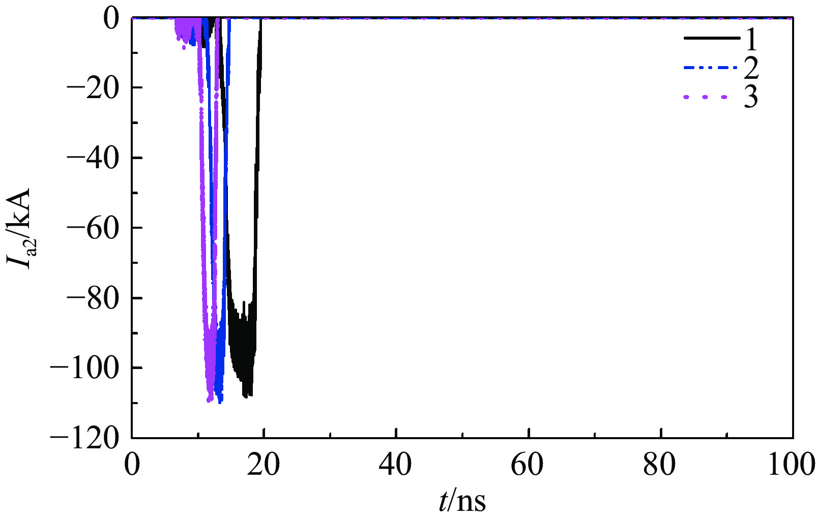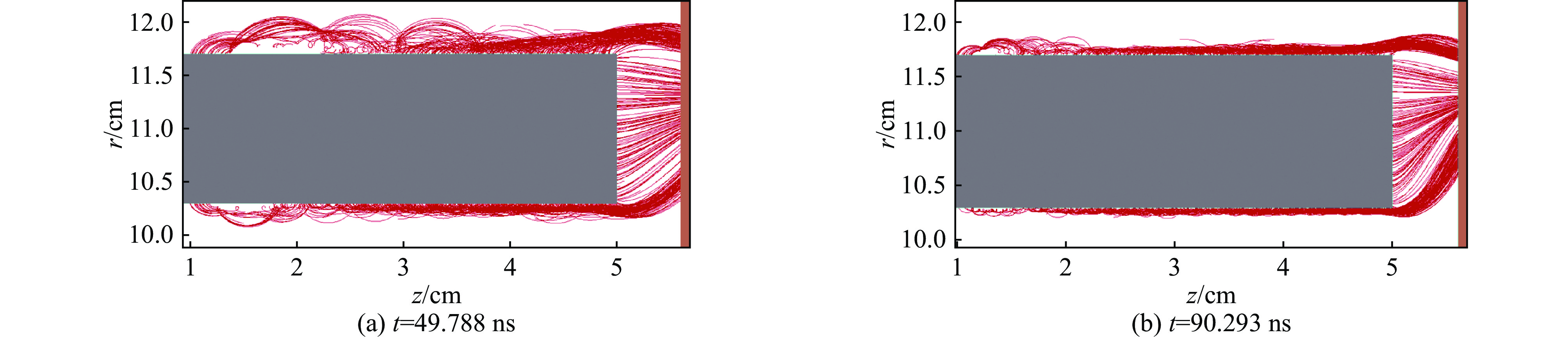 When the peak diode voltage is 1.5 MV, simulation results showed that the total beam current obtained on the target is about 2.47 MA, the impedance is 0.6 Ω and the maximum intensity of the self-magnetic field in the diode reaches 1.7 T. The typical physical images such as the spatial distribution of electric field and angular self-magnetic field in the diode, the distribution of electrons in real space and phase space, the distribution of electron numbers versus the electron energy, the radial position, and impact angles on the anode target surface are given by simulations. The influence of diode voltage waveform and end axial gap length on diode impedance, current and electron beam trajectory are also obtained by simulations when the other structural parameters are fixed.