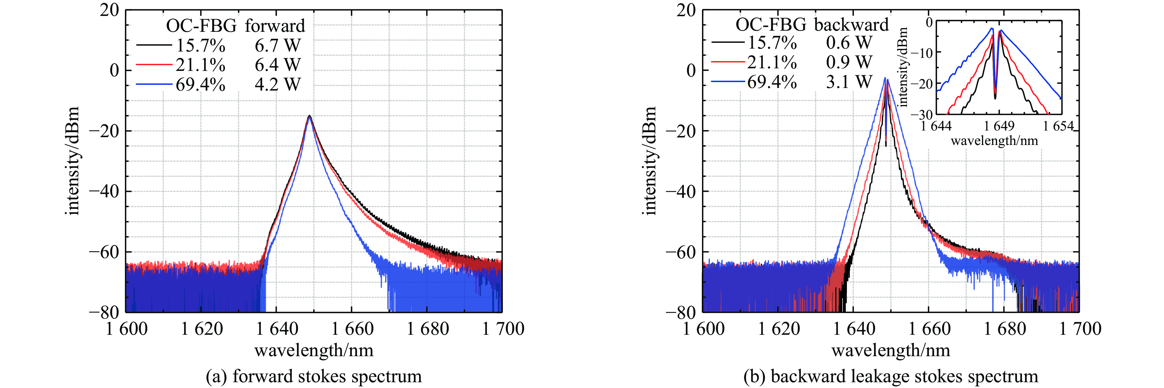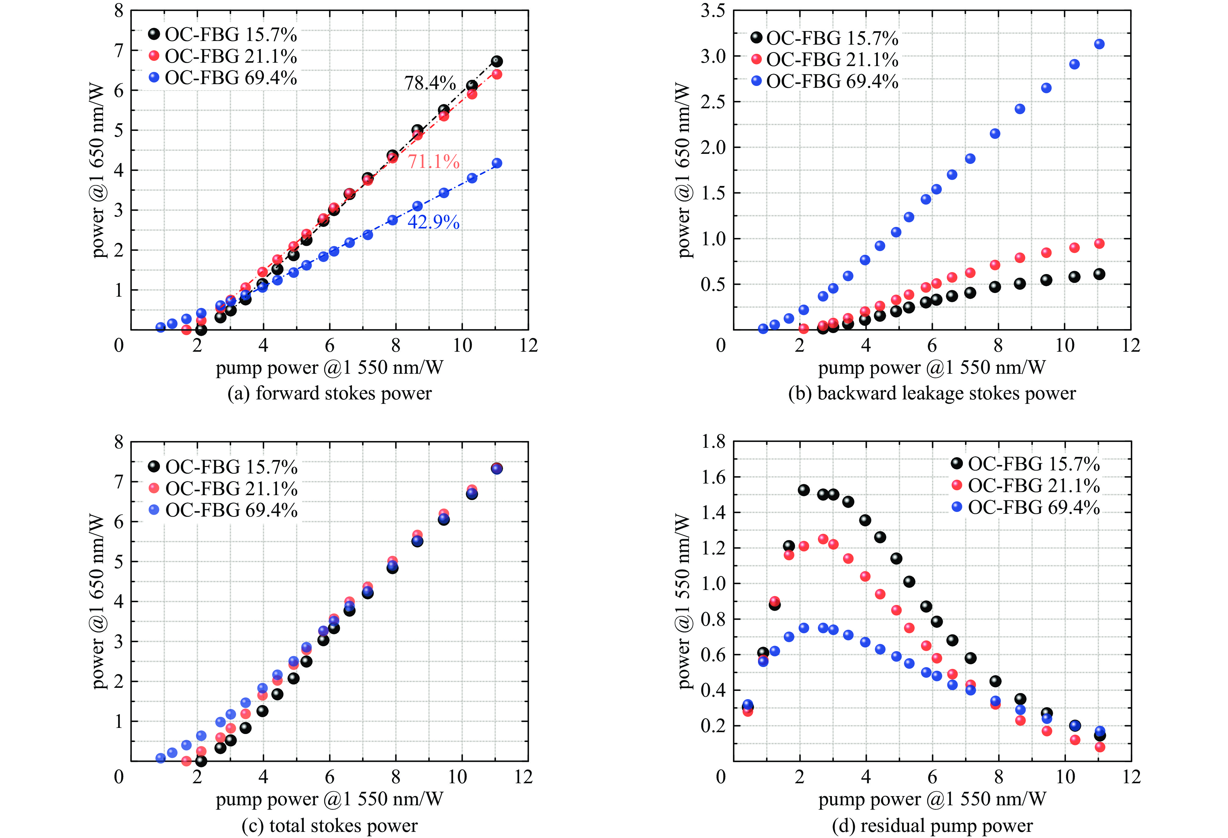 The results indicated that as the Raman laser power increased, the broadening of the Stokes spectral linewidth reduced the effective reflectivity of the fiber Bragg grating, leading to backward power leakage, which became the main factor limiting the forward output power.