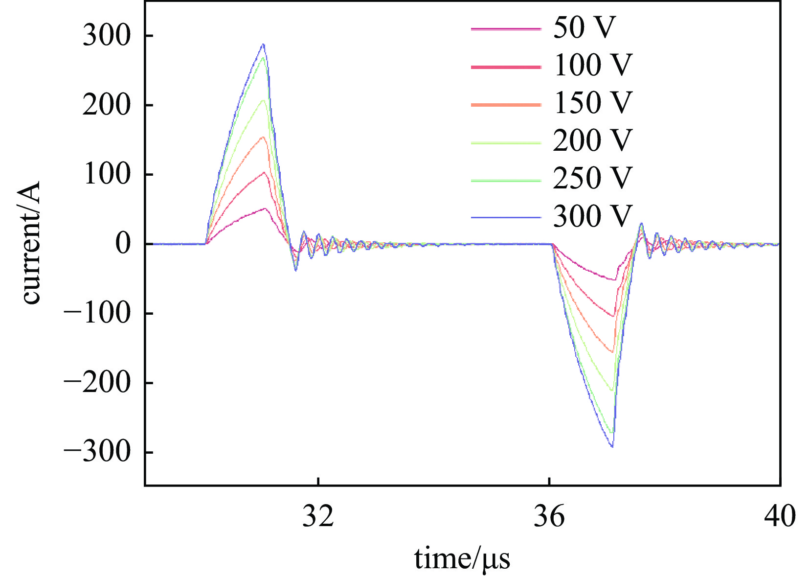 Experimental results demonstrate that, under DC bus voltages from 50 V to 300 V, the peak output current exhibits excellent linear correlation with the bus voltage, while pulse-width adjustment enables continuously controllable peak current with a maximum enhancement of 37%. The system is capable of delivering bipolar pulse currents up to ±300 A, confirming the compatibility of high-current output with compact integration. In addition, at a 500\begin{document}$ \;ns $\end{document} pulse width, the four-device paralleled branch achieves a current-sharing imbalance factor of 12.87%, validating the effectiveness of the cooperative gate-drive scheme and the use of independent gate resistors.