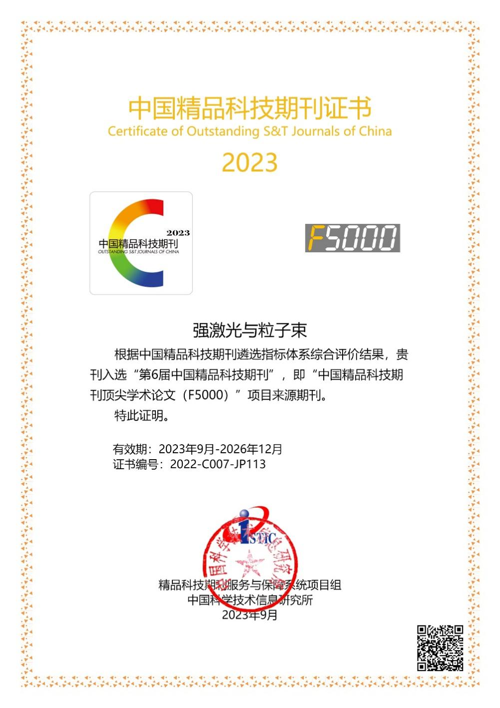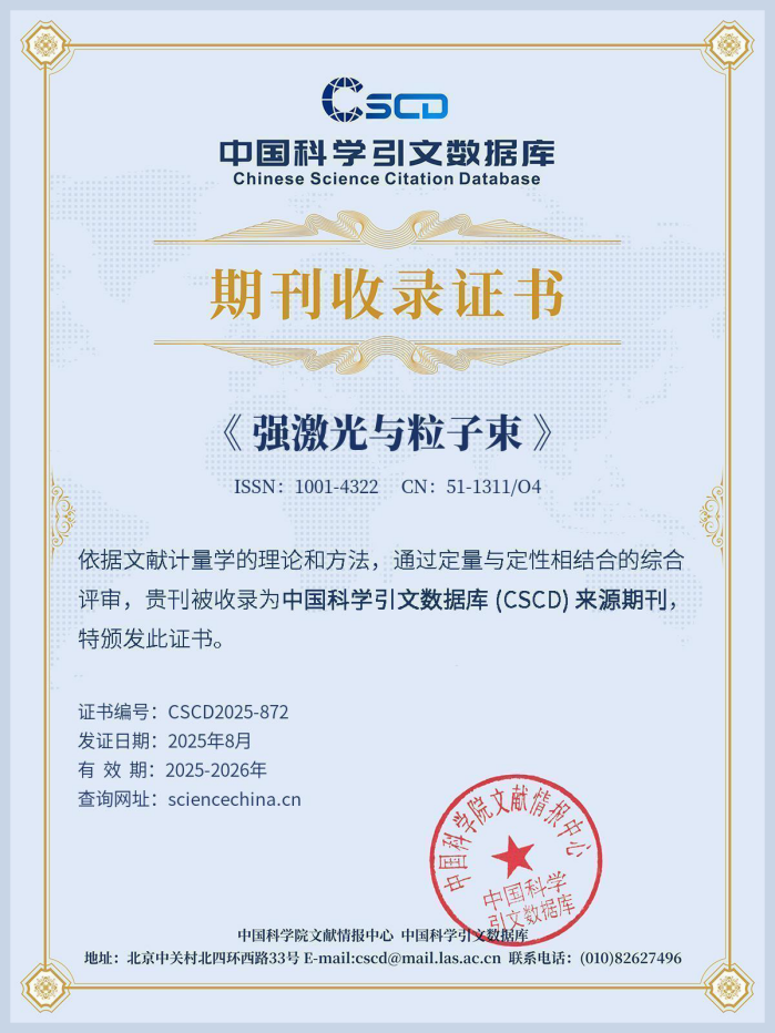 《强激光与粒子束》是我国中文核心期刊、中国科技核心期刊、CSCD核心期刊、国家期刊方阵双效期刊、中国精品科技期刊,被中国知网(CNKI)、万方和维普数字期刊网、中国光学期刊网全文收录,被美国化学文摘(CA)、英国INSPEC、荷兰Scopus、日本JST等国际文献数据库收录。