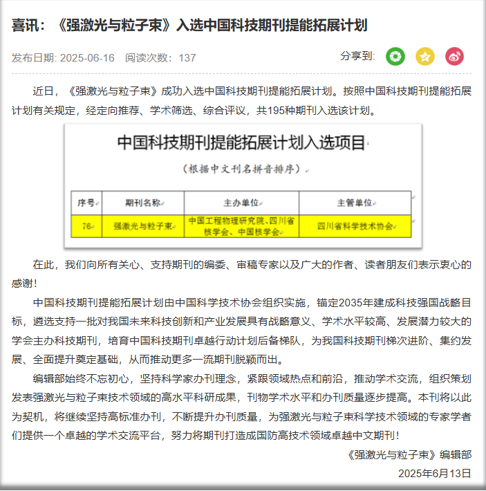 2025年的出版任务已经全部完成,在此,编辑部衷心感谢所有作者、审稿专家、广大读者与编委团队的一路支持与信任!《强激光与粒子束》将始终坚守“服务科研、推动创新”的办刊宗旨,持续汇聚领域内前沿成果与思想,致力于打造更具影响力与传播力的高水平学术交流平台,与学界同行共赴新征程!