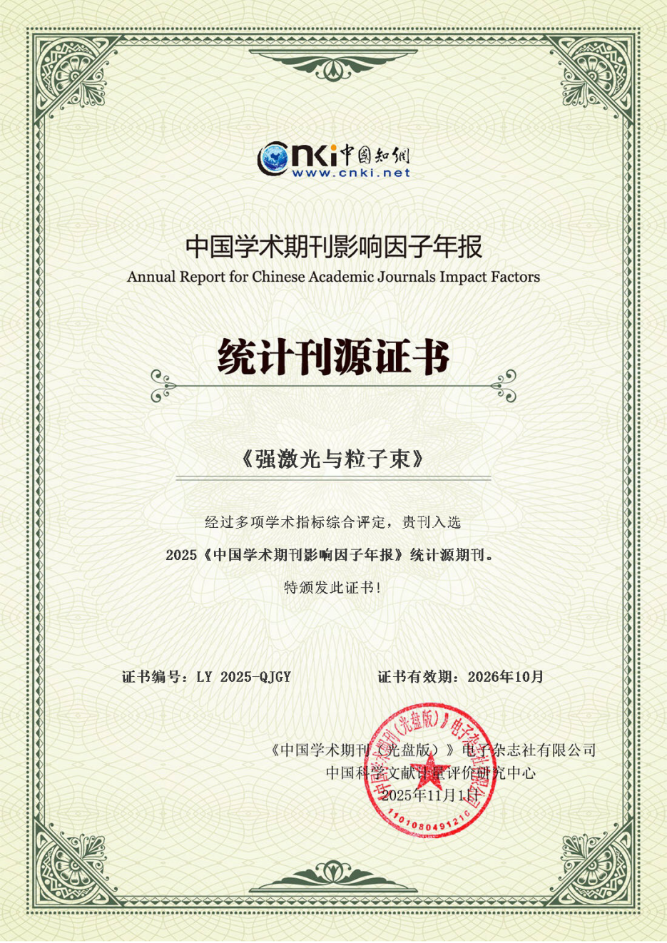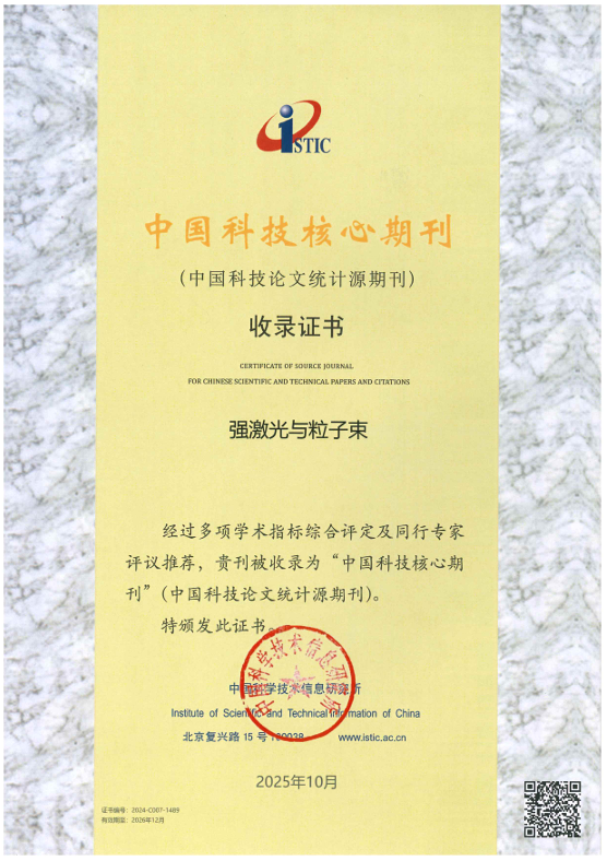 在中国科学技术信息研究所最新发布的“2025年中国科技论文统计结果”中,《强激光与粒子束》继续入选“中国科技核心期刊”(中国科技论文统计源期刊)。其CJCR影响因子从0.544升至0.583,涨幅7.2%,多项统计指标位于核科学技术学科第一。