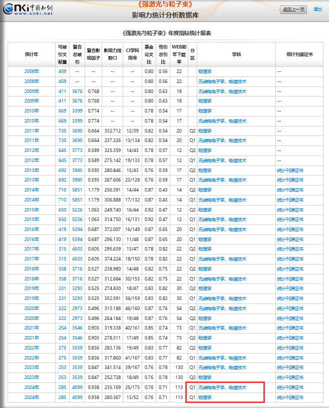 CNKI综合影响因子从0.612升至0.669,涨幅9.3%,首次跻身物理学、无线电电子学/电信技术两大学科领域Q1区。